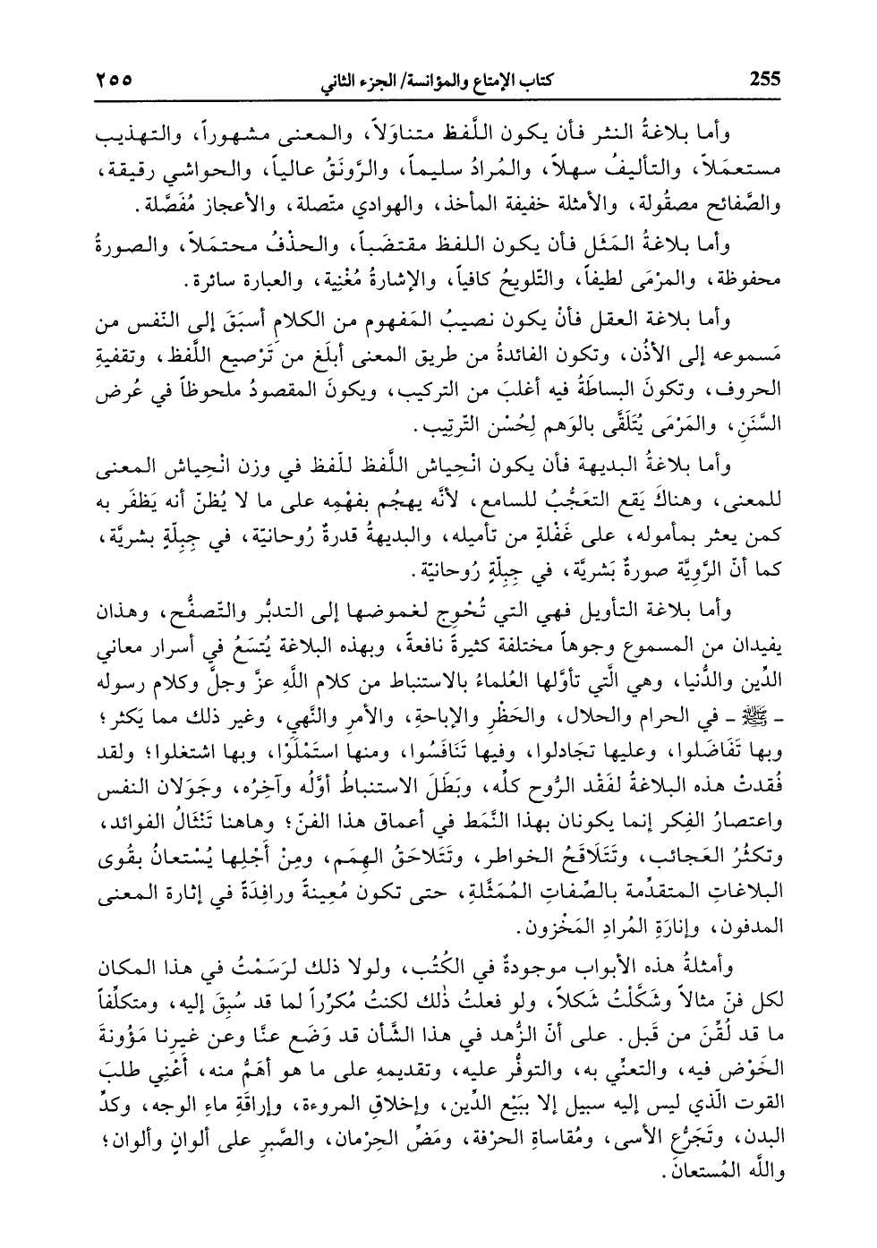 وأما بلاغة التأويل فهي التي تحوج لغموضها إلى التدبّر والتصفّح، وهذان يفيدان من المسموع وجوها مختلفة كثيرة نافعة، وبهذه البلاغة يتسع في أسرار معاني الدّين والدّنيا، وهي الّتي تأوّلها العلماء بالاستنباط من كلام الله عزّ وجلّ وكلام رسوله- صلّى الله عليه وسلّم- في الحرام والحلال، والحظر والإباحة، والأمر والنّهي، وغير ذلك مما يكثر، وبها تفاضلوا، وعليها تجادلوا، وفيها تنافسوا، ومنها استملوا، وبها اشتغلوا، ولقد فقدت هذه البلاغة لفقد الرّوح كلّه، وبطل الاستنباط أوّله وآخره، وجولان النفس واعتصار الفكر إنّما يكونان بهذا النّمط في أعماق هذا الفنّ، وهاهنا تنثال الفوائد، وتكثر العجائب، وتتلاقح الخواطر، وتتلاحق الهمم، ومن أجلها يستعان بقوى البلاغات المتقدّمة بالصّفات الممثّلة، حتى تكون معينة ورافدة في إثارة المعنى المدفون، وإنارة المراد المخزون.