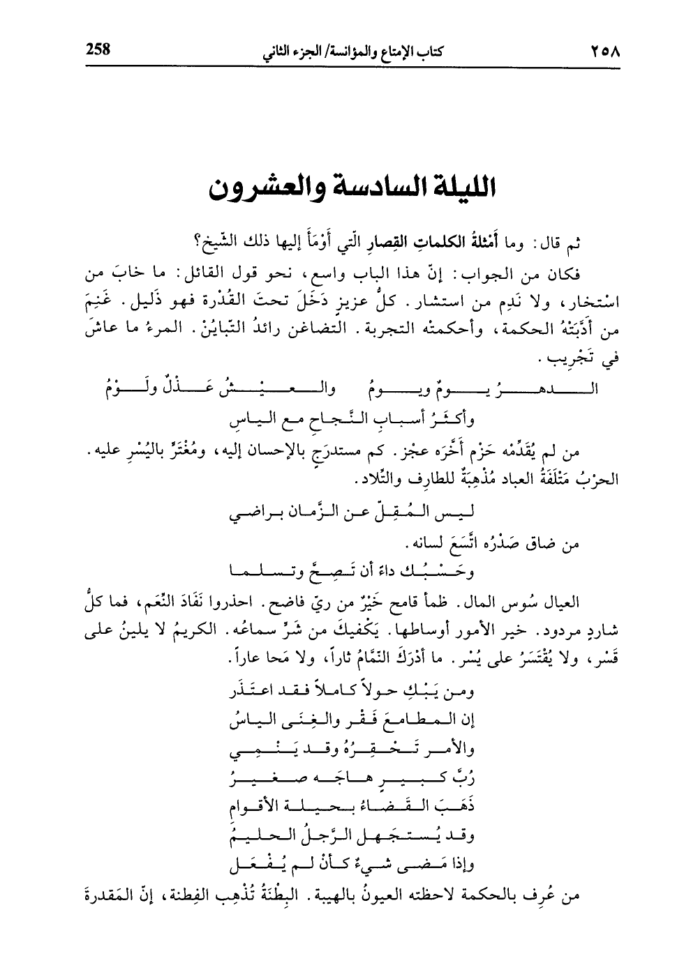 ثم قال: وما أمثلة الكلمات القصار الّتي أومأ إليها ذلك الشّيخ؟