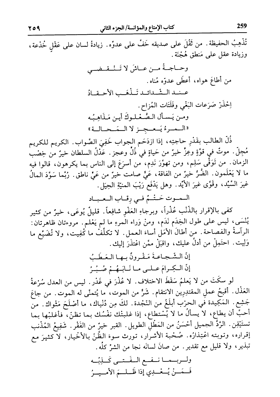 ذلّ الطالب بقدر حاجته، إذا ازدحم الجواب خفي الصّواب. الكريم للكريم مجلّ. موت في قوّة وعزّ خير من حياة في ذلّ وعجز. عدل السلطان خير من خصب الزمان. من توقّى سلم، ومن تهوّر ندم، من أسرع إلى الناس بما يكرهون، قالوا فيه ما لا يعلمون. الضّرّ خير من الفاقة، عيّ صامت خير من عيّ ناطق. ربّما سوّد المال غير السّيّد، وقوّى غير الأبّد. وهل يدفع ريب المنيّة الحيل.
