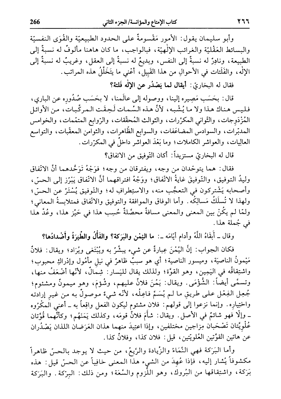 وأبو سليمان يقول: الأمور مقسومة على الحدود الطبيعيّة والقوى النفسيّة والبسائط العقليّة والغرائب الإلهيّة، فبالواجب، ما كان هاهنا مألوف له نسبة إلى الطبيعة، ونادر له نسبة إلى النفس، وبديع له نسبة إلى العقل، وغريب له نسبة إلى الإله، والفلتات في الأحوال من هذا القبيل، أعني ما يتخلّل هذه المراتب.