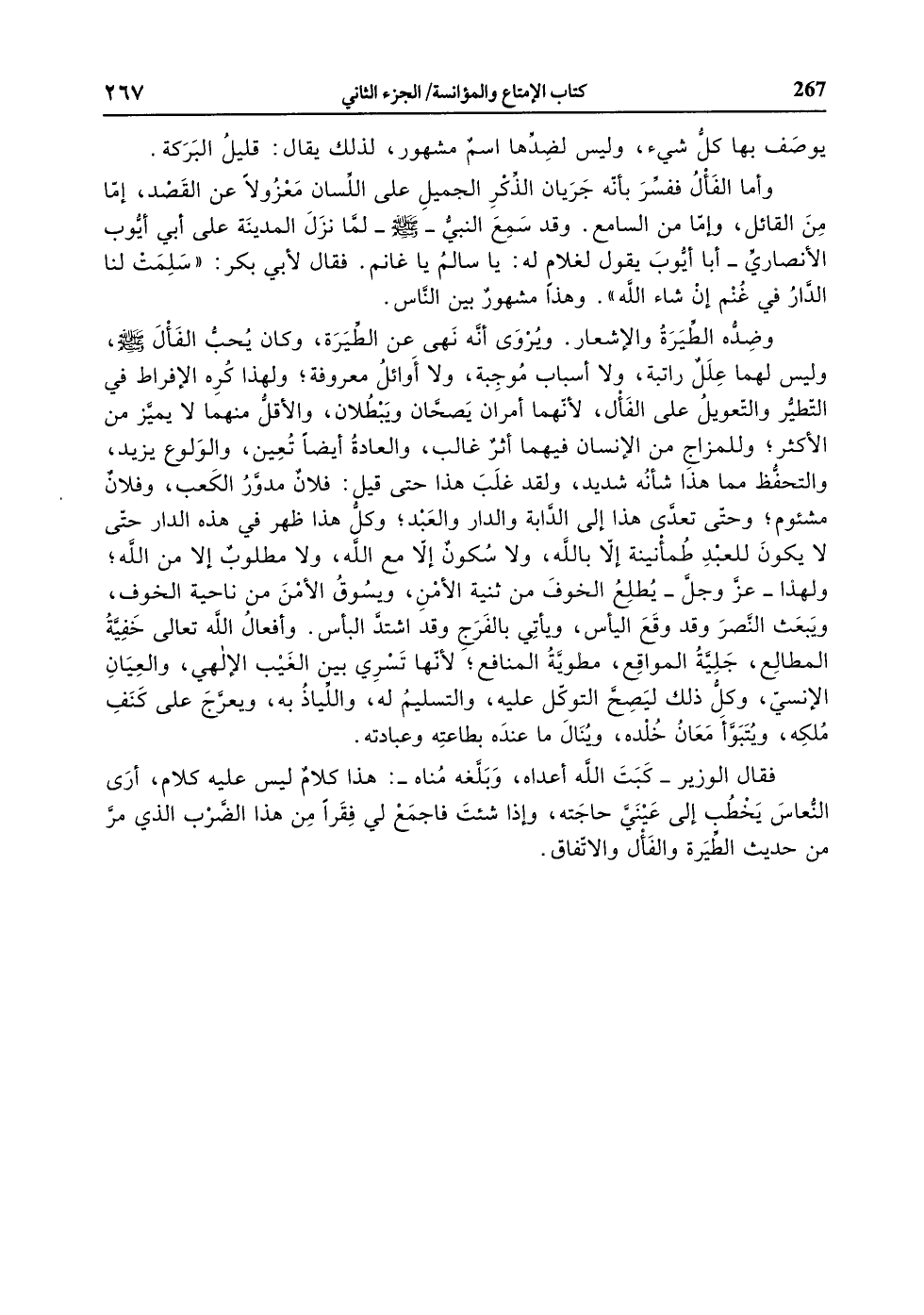 فقال الوزير- كبت الله أعداه، وبلّغه مناه-: هذا كلام ليس عليه كلام، أرى النّعاس يخطب إلى عينيّ حاجته، وإذا شئت فاجمع لي فقرا من هذا الضّرب الذي مرّ من حديث الطّيرة والفأل والاتّفاق.