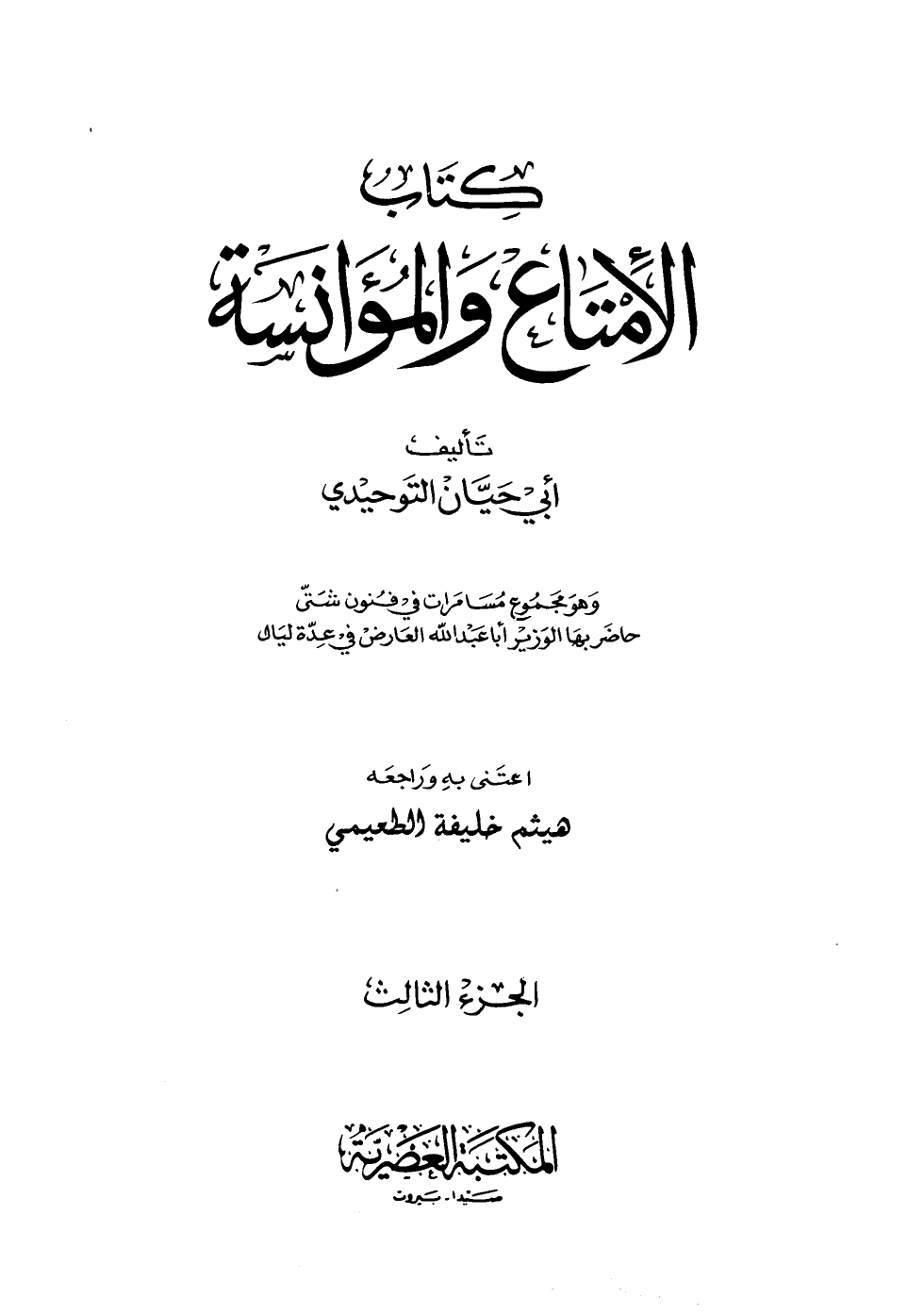 تأليف أبي حيّان التوحيدي وهو مجموع مسامرات في فنون شتّى حاضر بها الوزير أبا عبد الله العارض في عدّة ليال اعتنى به وراجعه هيثم خليفة الطعيمي الجزء الثالث المكتبة العصريّة صيدا- بيروت