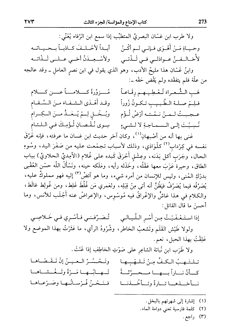 عنى بها أنه من أصبهان «1» ، وكان آخر حديث ابن غسان ما عرفته، فإنه غرّق نفسه في كرداب «2» كلواذي، وذلك لأسباب تجمّعت عليه من صفر اليد، وسوء الحال، وجرب أكل بدنه، وعشق أحرق كبده على غلام (الآمديّ الحلاويّ) بباب الطاق، وحيرة عزب معها عقله، وخذله رأيه، وملكه حينه، ونسأل الله حسن العقبى بدرك المنى، وليس للإنسان من أمره شيء، وما هو آئض «3» إليه فهو مملوك عليه، يصرّفه فيما يصرّف فيظنّ أنه أتى من قبله، ولعمري من غلّط غلط، ومن غولط غالط، والكلام في هذا غاشّ والإغراق فيه موسوس، والإعراض عنه أجلب للأنس، وما أحسن ما قال القائل: