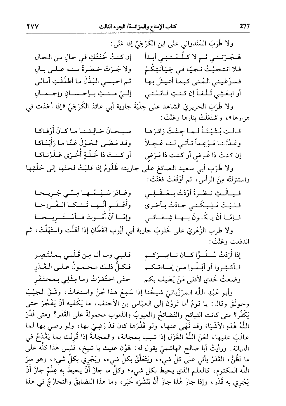 وأبو عبد الله المرزبانيّ شيخنا إذا سمع هذا جنّ واستغاث، وشقّ الجيب وحولق وقال: يا قوم أما ترون إلى العبّاس بن الأحنف، ما يكفيه أن يفجرّ حتى يكفّر؟ متى كانت القبائح والفضائح والعيوب والذنوب محمولة على القدر؟ ومتى قدّر الله هذه الأشياء وقد نهى عنها، ولو قدّرها كان قد رضي بها، ولو رضي بها لما عاقب عليها، لعن الله الغزل إذا شيب بمجانة، والمجانة إذا قرنت بما يقدح في الديانة. ورأيت أبا صالح الهاشميّ يقول له: هوّن عليك يا شيخ، فليس هذا كلّه على ما تظنّ، القدر يأتي على كلّ شيء، ويتعلّق بكلّ شيء، ويجري بكلّ شيء، وهو سرّ الله المكتوم، كالعلم الذي يحيط بكل شيء، وكلّ ما جاز أن يحيط به علم جاز أن يجري به قدر، وإذا جاز هذا جاز أن ينشره خبر، وما هذا التضايق والتحارج في هذا