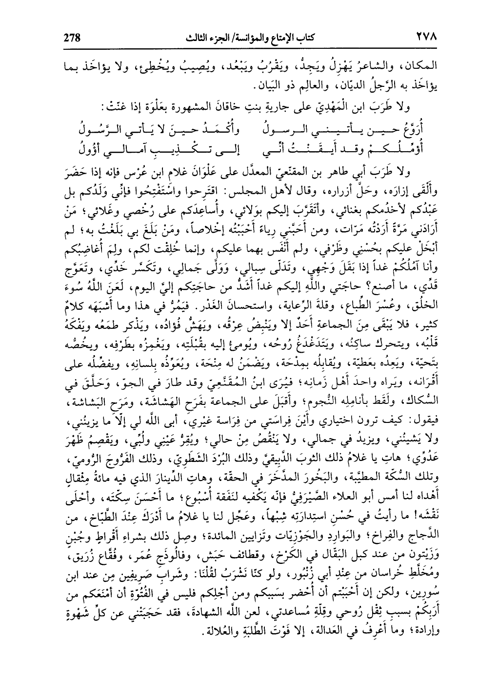 ولا طرب أبي طاهر بن المقنّعيّ المعدّل على علوان غلام ابن عرس فإنه إذا حضر وألقى إزاره، وقال لأهل المجلس: اقترحوا واستفتحوا فإنّي ولدكم بل عبدكم لأخدمكم بغنائي، وأتقرّب إليكم بولائي، وأساعدكم على رخصي وغلائي، من أرادني مرّة أردته مرّات، ومن أحبّني رياء أحببته إخلاصا، ومن بلغ بي بلغت به، لم أبخل عليكم بحسني وظرفي، ولم أنفس بهما عليكم، وإنما خلقت لكم، ولم أغاضبكم وأنا آملكم غدا إذا بقل وجهي، وتدلّى سبالي، وولّى جمالي، وتكسّر خدّي، وتعوّج قدّي، ما أصنع؟ حاجتي والله إليكم غدا أشدّ من حاجتكم إليّ اليوم، لعن الله سوء الخلق، وعسر الطّباع، وقلة الرّعاية، واستحسان الغدر. فيمرّ في هذا وما أشبهه كلام كثير، فلا يبقى من الجماعة أحد إلا وينبض عرقه، ويهشّ فؤاده، ويذكر طمعه ويفكه قلبه، ويتحرك ساكنه، ويتدغدغ روحه، ويومئ إليه بقبلته، ويغمزه بطرفه، ويخصّه بتحيّة، ويعده بعطيّة، ويقابله بمدحة، ويضمن له منحة، ويعوّذه بلسانه، ويفضّله على أقرانه، ويراه واحد أهل زمانه، فيرى ابن المقنّعيّ وقد طار في الجوّ، وحلّق في السّكاك، ولقط بأنامله النّجوم، وأقبل على الجماعة بفرح الهشاشة، ومرح البشاشة، فيقول: كيف ترون اختياري وأين فراستي من فراسة غيري، أبي الله لي إلّا ما يزينني، ولا يشينني، ويزيد في جمالي، ولا ينقص من حالي، ويقرّ عيني ولبّي، ويقصم ظهر عدوّي، هات يا غلام ذلك الثوب الدّبيقيّ وذلك البرد الشطويّ، وذلك الفرّوج الرّوميّ، وتلك السّكّة المطيّبة، والبخور المدّخر في الحقّة، وهات الدّينار الذي فيه مائة مثقال أهداه لنا أمس أبو العلاء الصّيرفيّ فإنّه يكفيه لنفقة أسبوع، ما أحسن سكّته، وأحلى نقشه! ما رأيت في حسن استدارته شبها، وعجّل لنا يا غلام ما أدرك عند الطّبّاخ، من الدّجاج والفراخ، والبوارد والجوزيّات وتزايين المائدة، وصل ذلك بشراء أقراط وجبن وزيتون من عند كبل البقّال في الكرخ، وقطائف حبش، وفالوذج عمر، وفقّاع زريق، ومخلّط خراسان من عند أبي زنبور، ولو كنّا نشرب لقلنا: وشراب صريفين من عند ابن سورين، ولكن إن أحببتم أن أحضر بسببكم ومن أجلكم فليس في الفتوّة أن أمنعكم من أربكم بسبب ثقل روحي وقلّة مساعدتي، لعن الله الشهادة، فقد حجبتني عن كلّ شهوة وإرادة، وما أعرف في العدالة، إلا فوت الطّلبة والعلالة.