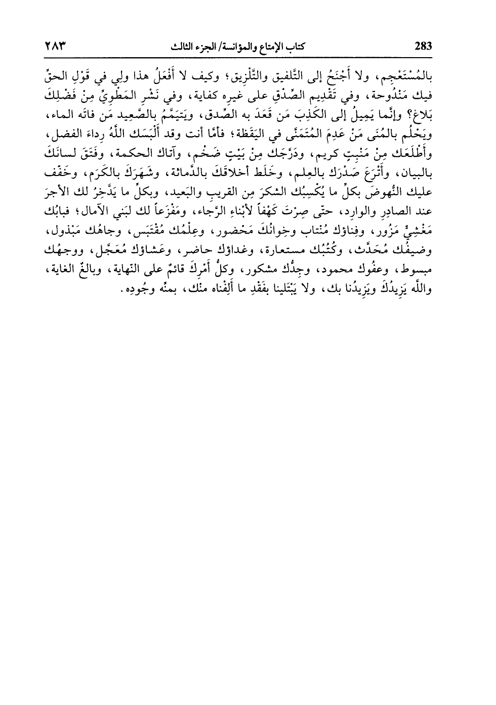 بالمستعجم، ولا أجنح إلى التّلفيق والتّلزيق، وكيف لا أفعل هذا ولي في قول الحقّ فيك مندوحة، وفي تقديم الصّدق على غيره كفاية، وفي نشر المطويّ من فضلك بلاغ؟ وإنّما يميل إلى الكذب من قعد به الصّدق، ويتيمّم بالصّعيد من فاته الماء، ويحلم بالمنى من عدم المتمنّى في اليقظة، فأمّا أنت وقد ألبسك الله رداء الفضل، وأطلعك من منبت كريم، ودرّجك من بيت ضخم، وآتاك الحكمة، وفتق لسانك بالبيان، وأترع صدرك بالعلم، وخلط أخلاقك بالدّماثة، وشهرك بالكرم، وخفّف عليك النّهوض بكلّ ما يكسبك الشكر من القريب والبعيد، وبكلّ ما يدّخر لك الأجر عند الصادر والوارد، حتّى صرت كهفا لأبناء الرّجاء، ومفزعا لك لبني الآمال، فبابك مغشيّ مزور، وفناؤك منتاب وخوانك محضور، وعلمك مقتبس، وجاهك مبذول، وضيفك محدّث، وكتبك مستعارة، وغداؤك حاضر، وعشاؤك معجّل، ووجهك مبسوط، وعفوك محمود، وجدّك مشكور، وكلّ أمرك قائم على النّهاية، وبالغ الغاية، والله يزيدك ويزيدنا بك، ولا يبتلينا بفقد ما ألفناه منك، بمنّه وجوده.