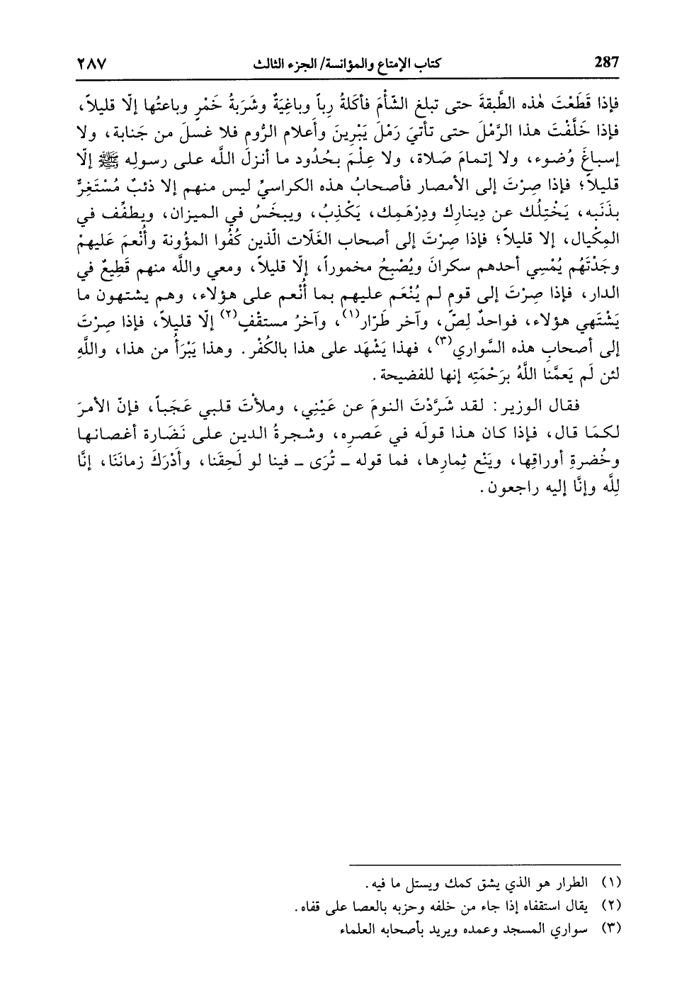 فإذا قطعت هذه الطّبقة حتى تبلغ الشّأم فأكلة ربا وباغية وشربة خمر وباعتها إلّا قليلا، فإذا خلّفت هذا الرّمل حتى تأتي رمل يبرين وأعلام الرّوم فلا غسل من جنابة، ولا إسباغ وضوء، ولا إتمام صلاة، ولا علم بحدود ما أنزل الله على رسوله صلّى الله عليه وسلّم إلّا قليلا، فإذا صرت إلى الأمصار فأصحاب هذه الكراسيّ ليس منهم إلا ذئب مستغرّ بذنبه، يختلك عن دينارك ودرهمك، يكذب، ويبخس في الميزان، ويطفّف في المكيال، إلا قليلا، فإذا صرت إلى أصحاب الغلّات الّذين كفوا المؤونة وأنعم عليهم وجدتهم يمسي أحدهم سكران ويصبح مخمورا، إلّا قليلا، ومعي والله منهم قطيع في الدار، فإذا صرت إلى قوم لم ينعم عليهم بما أنعم على هؤلاء، وهم يشتهون ما يشتهي هؤلاء، فواحد لصّ، وآخر طرّار «1» ، وآخر مستقف «2» إلّا قليلا، فإذا صرت إلى أصحاب هذه السّواري «3» ، فهذا يشهد على هذا بالكفر. وهذا يبرأ من هذا، والله لئن لم يعمّنا الله برحمته إنها للفضيحة.