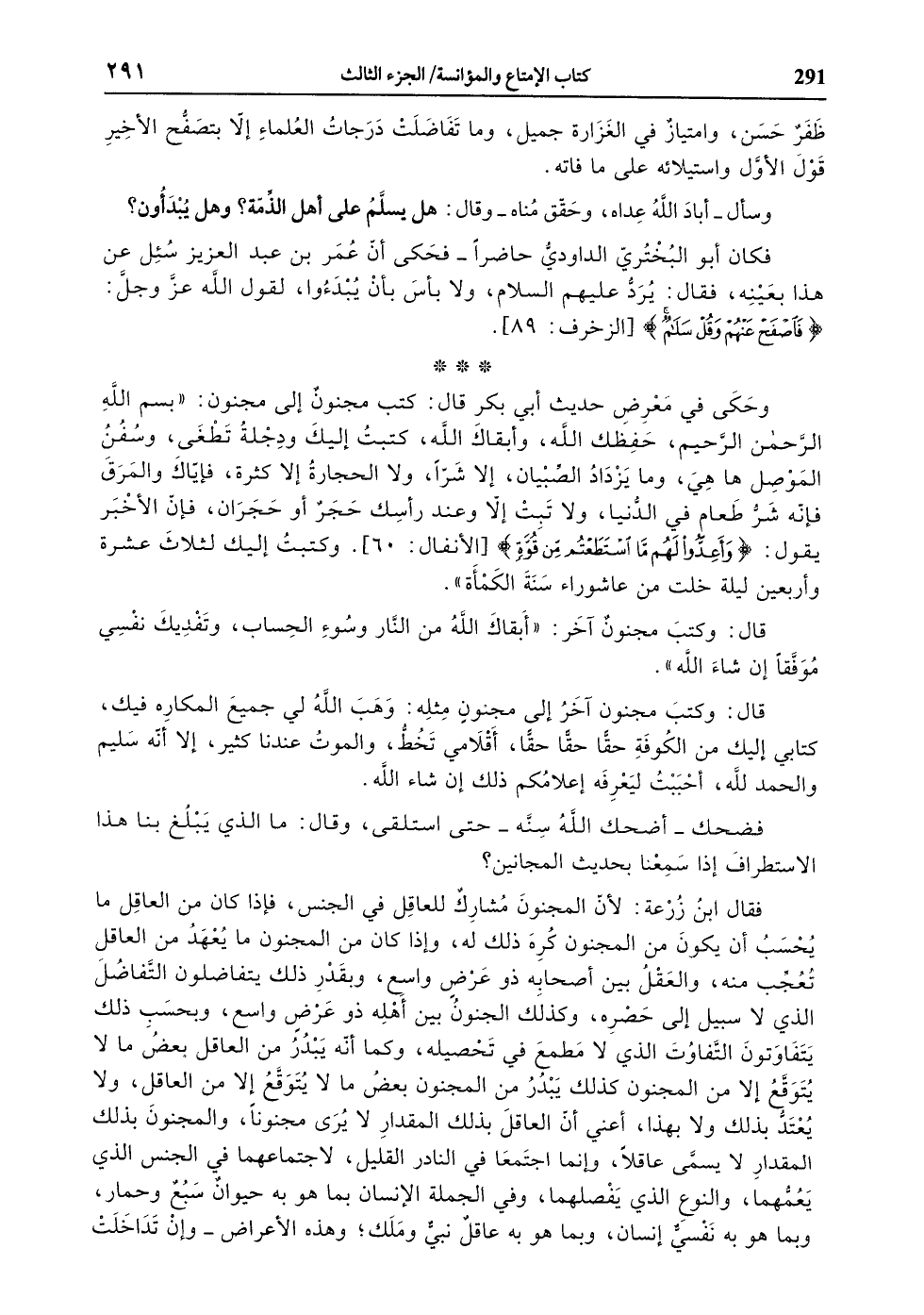 قال: وكتب مجنون آخر: «أبقاك الله من النّار وسوء الحساب، وتفديك نفسي موفّقا إن شاء الله» .