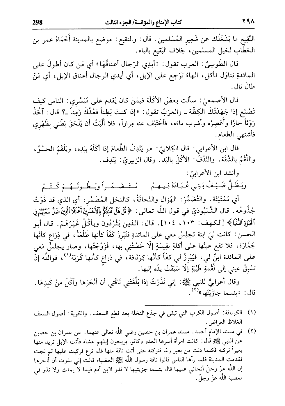 النّقيع ما يشغلك عن شعير المسلمين. قال: والنقيع: موضع بالمدينة أحماه عمر بن الخطّاب لخيل المسلمين، خلاف البقيع بالباء.