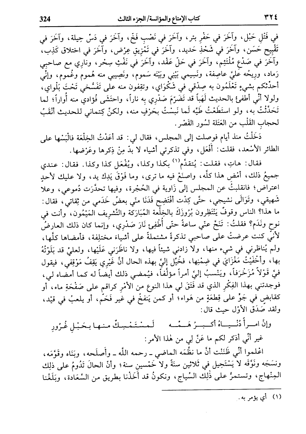 ما هذا؟ الناس وقوف ينتظرون بروزك بالخلعة المباركة والتّشريف الميمون، وأنت في نوح وندم؟ فقلت: تنحّ عنّي ساعة حتّى أطفئ نار صدري، وإنما كان ذلك العارض لأنّي كنت عرضت على صاحبي تذكرة مشتملة على أشياء مختلفة، فأمضاها كلّها، ولم يناظرني في شيء منها، ولا زادني شيئا فيها، ولا ناظرني عليها، ولعليّ قد بلوته بها، وأخفيت مغزاي في ضمنها، فخيّل إليّ بهذه الحال أنّ غيري يقف موقفي، فيقول فيّ قولا مزخرفا، وينسب إليّ أمرا مؤلّفا، فيمضي ذلك أيضا له كما أمضاه لي، فوجدتني بهذا الفكر الذي قد فتق لي هذا النوع من الأمر كراقم على صفحة ماء، أو كقابض في جوّ على قطعة من هواء، أو كمن ينفخ في غير فحم، أو يلعب في قيد، ولقد صدق الأوّل حيث قال: