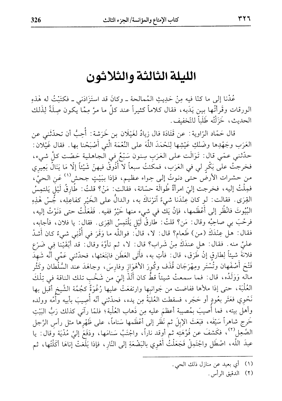 حدّثني عمّي قال: توالت على العرب سنون سبع في الجاهلية حصّت كلّ شيء، فخرجت على بكر لي في العرب، فمكثت سبعا لا أذوق فيهنّ شيئا إلّا ما ينال بعيري من حشرات الأرض حتى دنوت إلى حواء عظيم، فإذا ببيت جحش «1» عن الحيّ، فملت إليه، فخرجت إليّ امرأة طوالة حسّانة، فقالت: من؟ قلت: طارق ليل يلتمس القرى. فقالت: لو كان عندنا شيء آنرناك به، والدالّ على الخير كفاعله، جس هذه البيوت فانظر إلى أعظمها، فإن يك في شيء منها خير ففيه. ففعلت حتى دنوت إليه، فرحّب بي صاحبه وقال: من؟ قلت: طارق ليل يلتمس القرى. فقال: يا فلان، فأجابه، فقال: هل عندك (من) طعام؟ قال: لا، قال: فو الله ما وقر في أذني شيء كان أشدّ عليّ منه. فقال: هل عندك من شراب؟ قال: لا، ثم تأوّه وقال: قد أبقينا في ضرع فلانة شيئا لطارق إن طرق، قال: فأت به، فأتى العطن فابتعثها، فحدّثني عمّي أنّه شهد فتح أصفهان وتستر ومهرجان قذف وكور الأهواز وفارس، وجاهد عند السّلطان وكثر ماله وولده، قال: فما سمعت شيئا قطّ كان ألذّ إليّ من شخب تلك الناقة في تلك العلبة، حتى إذا ملأها ففاضت من جوانبها وارتفعت عليها رغوة كجمّة الشّيخ أقبل بها نحوي فعثر بعود أو حجر، فسقطت العلبة من يده، فحدّثني أنّه أصيب بأبيه وأمّه وولده وأهل بيته، فما أصيب بمصيبة أعظم عليه من ذهاب العلبة، فلمّا رآني كذلك ربّ البيت خرج شاهرا سيفه، فبعث الإبل ثم نظر إلى أعظمها سناما، على ظهرها مثل رأس الرّجل الصّعل «2» ، فكشف عن فوّهته ثم أوقد نارا، واجتبّ سنامها، ودفع إليّ مدية وقال: يا عبد الله، اصطل واجتمل فجعلت أهوي بالبضعة إلى النّار، فإذا بلغت إناها أكلتها، ثم