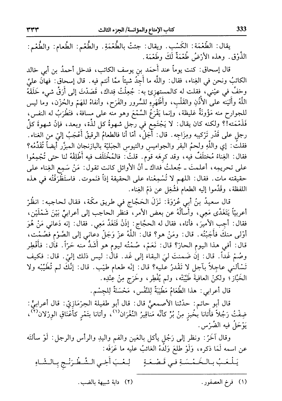 قال أبو حاتم: حدّثنا الأصمعيّ قال: قال أبو طفيلة الحرمازيّ: قال أعرابيّ: