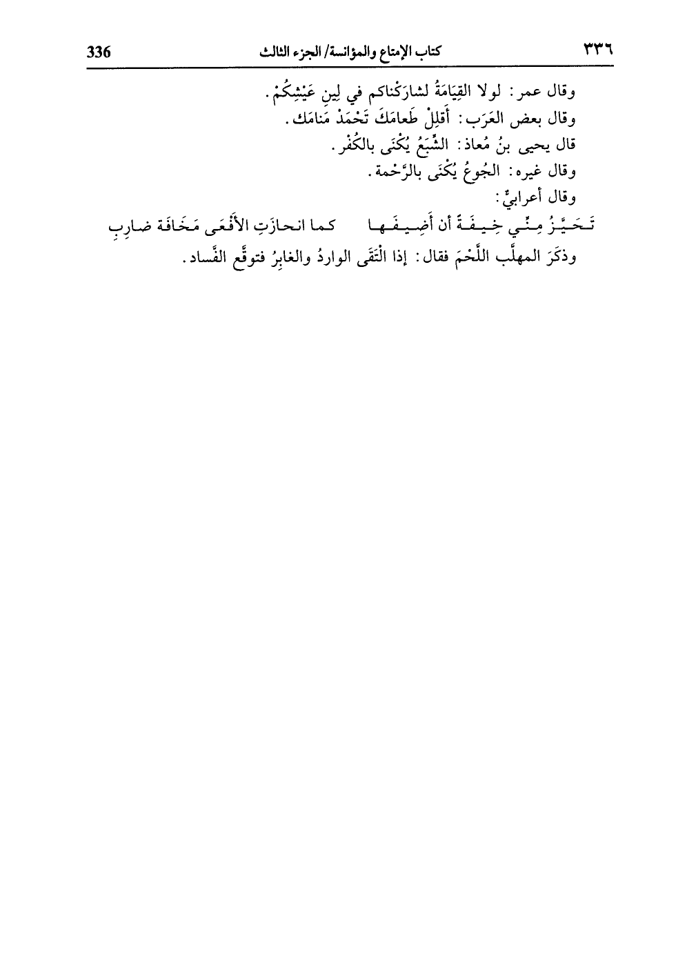 وذكر المهلّب اللّحم فقال: إذا التقى الوارد والغابر فتوقّع الفّساد.