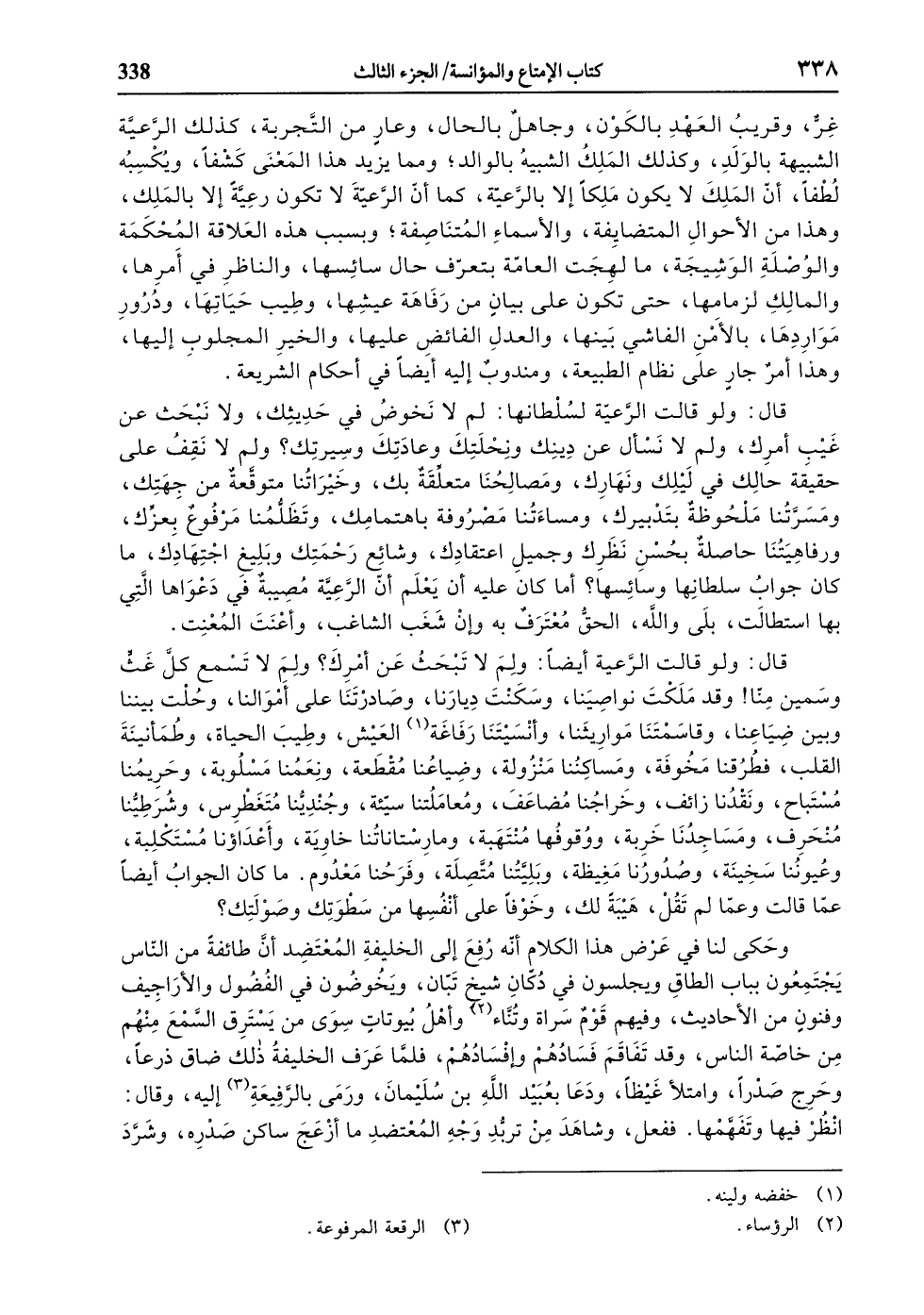 قال: ولو قالت الرّعيّة لسلطانها: لم لا نخوض في حديثك، ولا نبحث عن غيب أمرك، ولم لا نسأل عن دينك ونحلتك وعادتك وسيرتك؟ ولم لا نقف على حقيقة حالك في ليلك ونهارك، ومصالحنا متعلّقة بك، وخيراتنا متوقّعة من جهتك، ومسرّتنا ملحوظة بتدبيرك، ومساءتنا مصروفة باهتمامك، وتظلّمنا مرفوع بعزّك، ورفاهيتنا حاصلة بحسن نظرك وجميل اعتقادك، وشائع رحمتك وبليغ اجتهادك، ما كان جواب سلطانها وسائسها؟ أما كان عليه أن يعلم أنّ الرّعيّة مصيبة في دعواها الّتي بها استطالت، بلى والله، الحقّ معترف به وإن شغب الشاغب، وأعنت المعنت.
