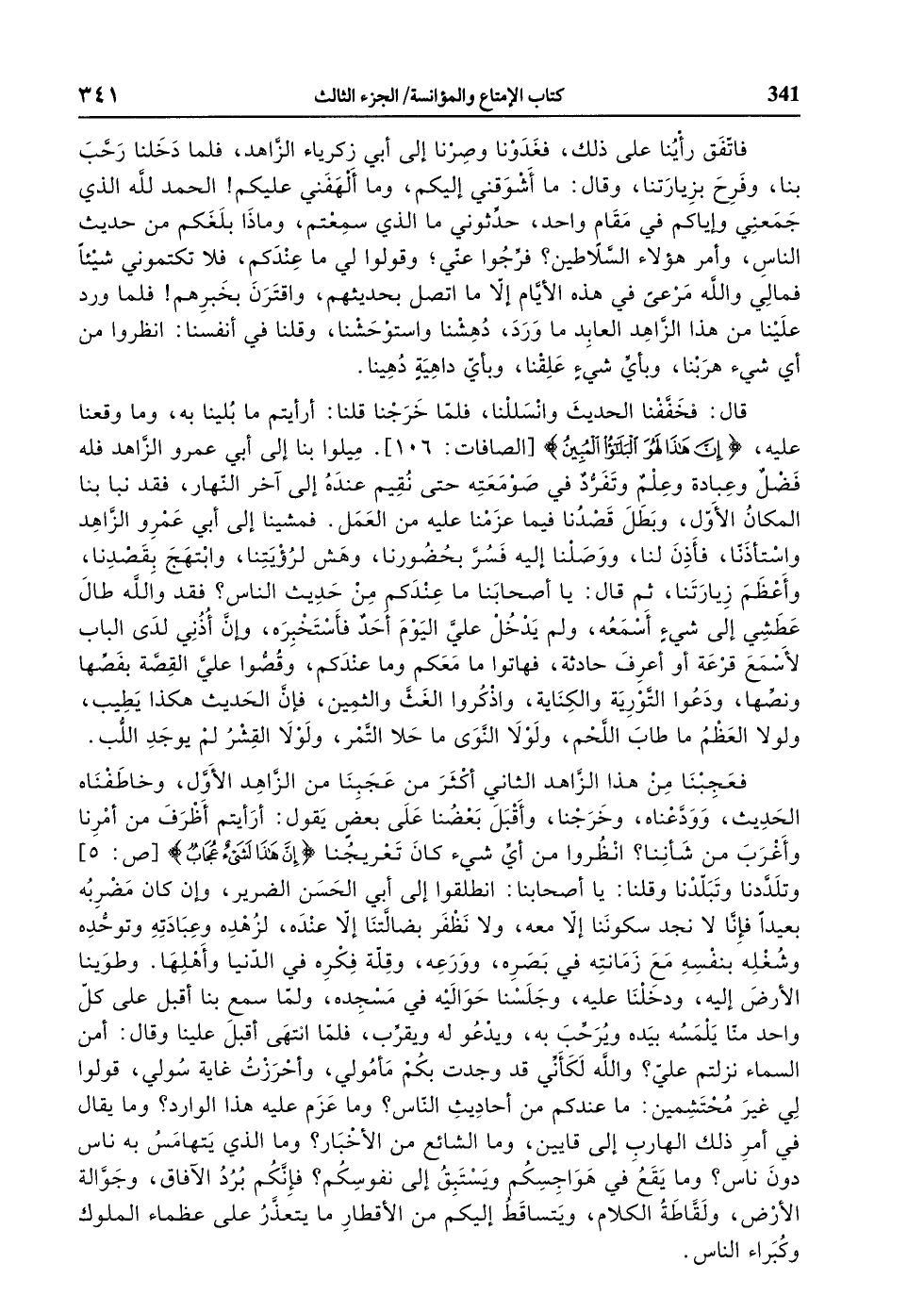 فاتّفق رأينا على ذلك، فغدونا وصرنا إلى أبي زكرياء الزّاهد، فلما دخلنا رحّب بنا، وفرح بزيارتنا، وقال: ما أشوقني إليكم، وما ألهفني عليكم! الحمد لله الذي جمعني وإياكم في مقام واحد، حدّثوني ما الذي سمعتم، وماذا بلغكم من حديث الناس، وأمر هؤلاء السّلاطين؟ فرّجوا عنّي، وقولوا لي ما عندكم، فلا تكتموني شيئا فمالي والله مرعىّ في هذه الأيّام إلّا ما اتصل بحديثهم، واقترن بخبرهم! فلما ورد علينا من هذا الزّاهد العابد ما ورد، دهشنا واستوحشنا، وقلنا في أنفسنا: انظروا من أي شيء هربنا، وبأيّ شيء علقنا، وبأيّ داهية دهينا.