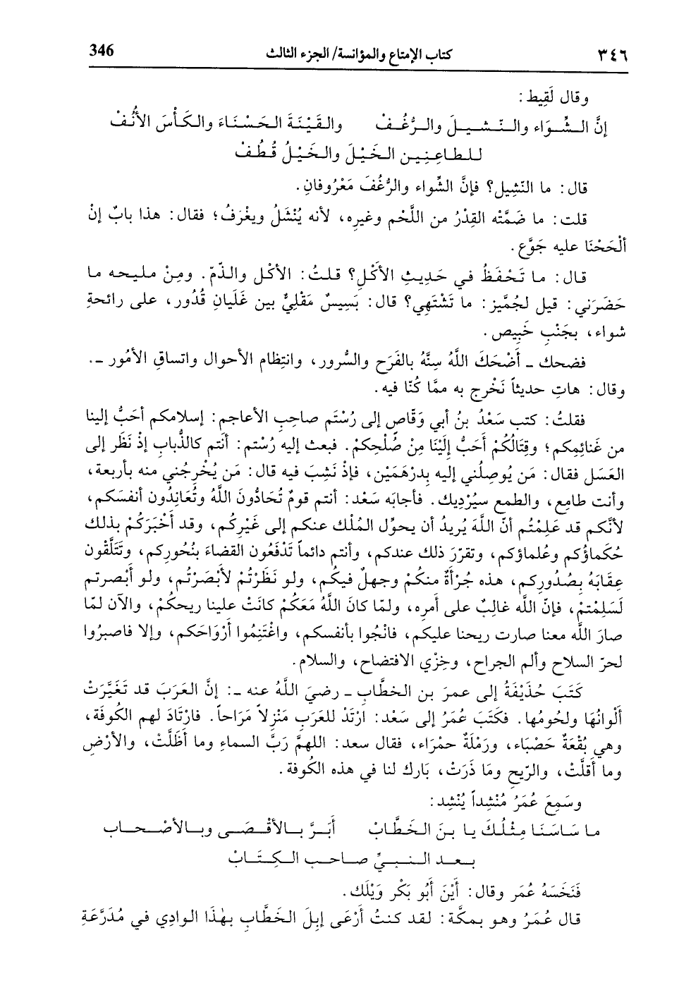 فقلت: كتب سعد بن أبي وقّاص إلى رستم صاحب الأعاجم: إسلامكم أحبّ إلينا من غنائمكم، وقتالكم أحبّ إلينا من صلحكم. فبعث إليه رستم: أنتم كالذّباب إذ نظر إلى العسل فقال: من يوصلني إليه بدرهمين، فإذ نشب فيه قال: من يخرجني منه بأربعة، وأنت طامع، والطمع سيرديك. فأجابه سعد: أنتم قوم تحادّون الله وتعاندون أنفسكم، لأنّكم قد علمتم أنّ الله يريد أن يحوّل الملك عنكم إلى غيركم، وقد أخبركم بذلك حكماؤكم وعلماؤكم، وتقرّر ذلك عندكم، وأنتم دائما تدفعون القضاء بنحوركم، وتتلّقون عقابه بصدوركم، هذه جرأة منكم وجهل فيكم، ولو نظرتم لأبصرتم، ولو أبصرتم لسلمتم، فإنّ الله غالب على أمره، ولمّا كان الله معكم كانت علينا ريحكم، والآن لمّا صار الله معنا صارت ريحنا عليكم، فانجوا بأنفسكم، واغتنموا أرواحكم، وإلا فاصبروا لحرّ السلاح وألم الجراح، وخزي الافتضاح، والسلام.