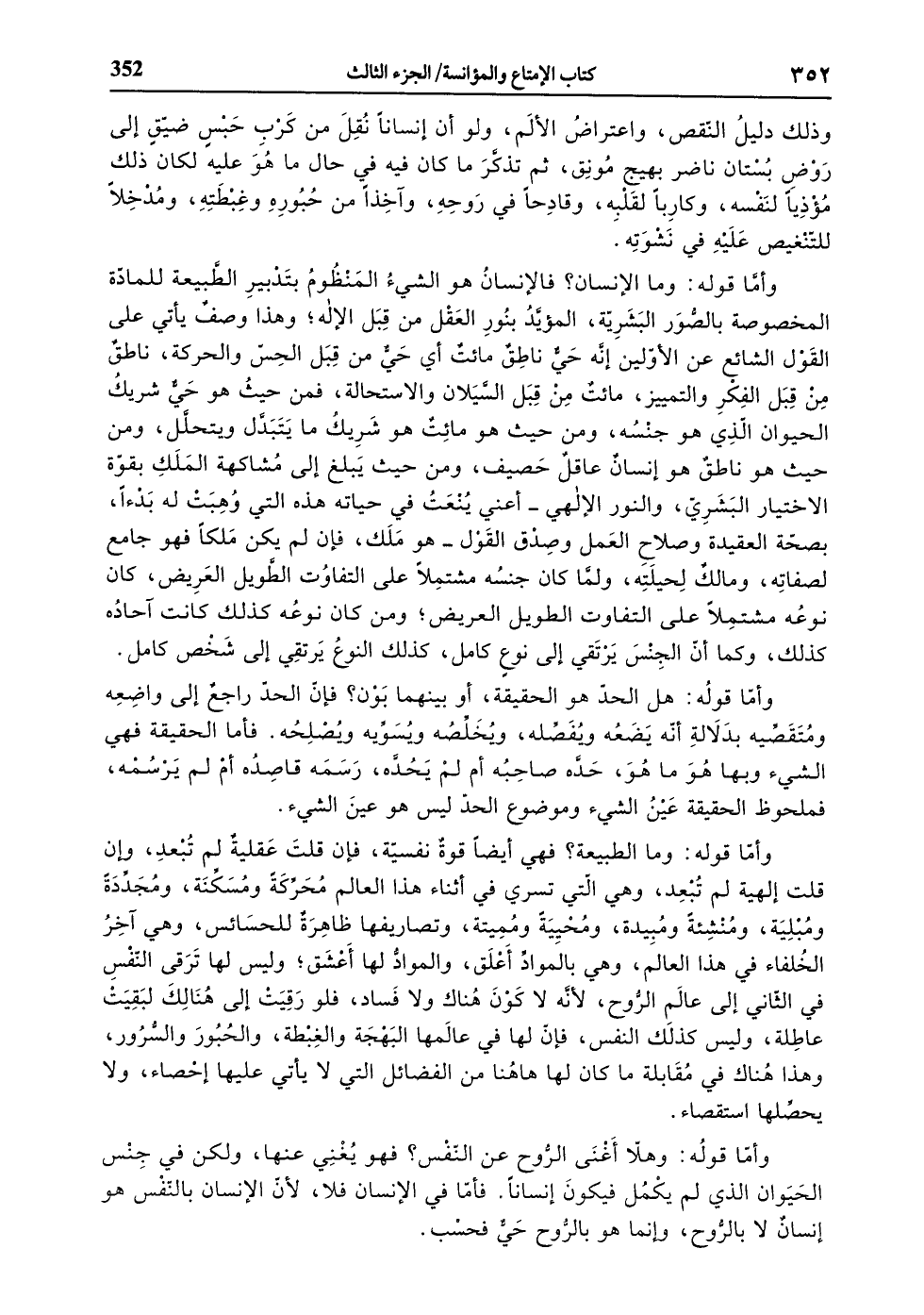 وأمّا قوله: وما الإنسان؟ فالإنسان هو الشيء المنظوم بتدبير الطّبيعة للمادّة المخصوصة بالصّور البشريّة، المؤيّد بنور العقل من قبل الإله، وهذا وصف يأتي على القول الشائع عن الأوّلين إنّه حيّ ناطق مائت أي حيّ من قبل الحسّ والحركة، ناطق من قبل الفكر والتمييز، مائت من قبل السّيلان والاستحالة، فمن حيث هو حيّ شريك الحيوان الّذي هو جنسه، ومن حيث هو مائت هو شريك ما يتبدّل ويتحلّل، ومن حيث هو ناطق هو إنسان عاقل حصيف، ومن حيث يبلغ إلى مشاكهة الملك بقوّة الاختيار البشريّ، والنور الإلهي- أعني ينعت في حياته هذه التي وهبت له بدءا، بصحّة العقيدة وصلاح العمل وصدق القول- هو ملك، فإن لم يكن ملكا فهو جامع لصفاته، ومالك لحيلته، ولمّا كان جنسه مشتملا على التفاوت الطّويل العريض، كان نوعه مشتملا على التفاوت الطويل العريض، ومن كان نوعه كذلك كانت آحاده كذلك، وكما أنّ الجنس يرتقي إلى نوع كامل، كذلك النوع يرتقي إلى شخص كامل.