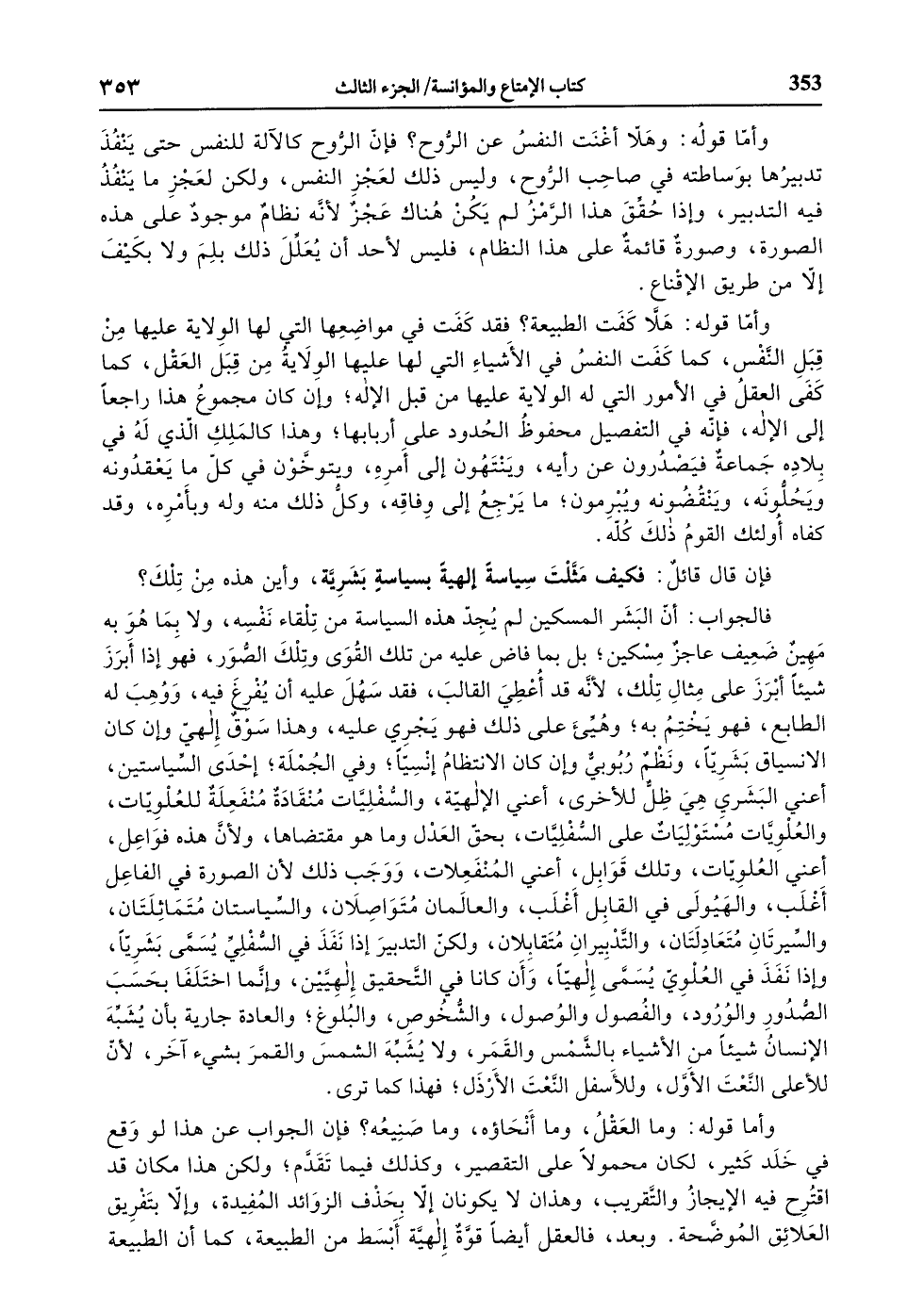 فالجواب: أنّ البشر المسكين لم يجدّ هذه السياسة من تلقاء نفسه، ولا بما هو به مهين ضعيف عاجز مسكين، بل بما فاض عليه من تلك القوى وتلك الصّور، فهو إذا أبرز شيئا أبرز على مثال تلك، لأنّه قد أعطي القالب، فقد سهل عليه أن يفرغ فيه، ووهب له الطابع، فهو يختم به، وهيّئ على ذلك فهو يجري عليه، وهذا سوق إلهيّ وإن كان الانسياق بشريّا، ونظم ربوبيّ وإن كان الانتظام إنسيّا، وفي الجملة، إحدى السّياستين، أعني البشري هي ظلّ للأخرى، أعني الإلهيّة، والسّفليّات منقادة منفعلة للعلويّات، والعلويّات مستوليات على السّفليّات، بحقّ العدل وما هو مقتضاها، ولأنّ هذه فواعل، أعني العلويّات، وتلك قوابل، أعني المنفعلات، ووجب ذلك لأن الصورة في الفاعل أغلب، والهيولى في القابل أغلب، والعالمان متواصلان، والسّياستان متماثلتان، والسّيرتان متعادلتان، والتّدبيران متقابلان، ولكنّ التدبير إذا نفذ في السّفليّ يسمّى بشريّا، وإذا نفذ في العلويّ يسمّى إلهيّا، وأن كانا في التّحقيق إلهيّين، وإنّما اختلفا بحسب الصّدور والورود، والفصول والوصول، والشّخوص، والبلوغ، والعادة جارية بأن يشبّه الإنسان شيئا من الأشياء بالشّمس والقمر، ولا يشبّه الشّمس والقمر بشيء آخر، لأنّ للأعلى النّعت الأوّل، وللأسفل النّعت الأرذل، فهذا كما ترى.