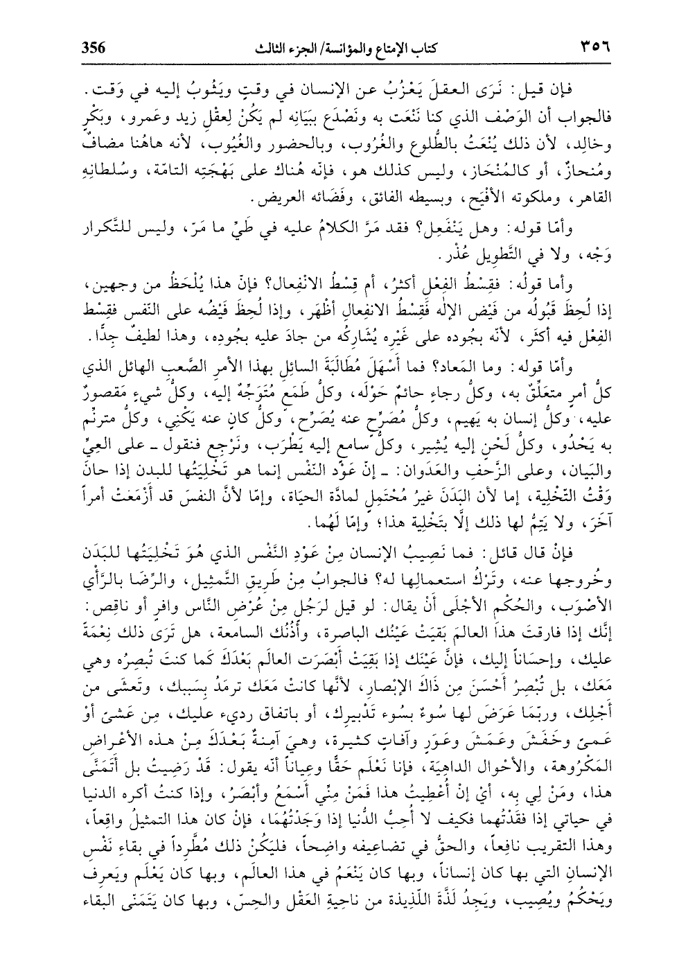 وأمّا قوله: وما المعاد؟ فما أسهل مطالبة السائل بهذا الأمر الصّعب الهائل الذي كلّ أمر متعلّق به، وكلّ رجاء حائم حوله، وكلّ طمع متوجّه إليه، وكلّ شيء مقصور عليه، وكلّ إنسان به يهيم، وكلّ مصرّح عنه يصرّح، وكلّ كان عنه يكني، وكلّ مترنّم به يحدو، وكلّ لحن إليه يشير، وكلّ سامع إليه يطرب، ونرجع فنقول- على العيّ والبيان، وعلى الزّحف والعدوان:- إنّ عود النّفس إنما هو تخليتها للبدن إذا حان وقت التّخلية، إما لأن البدن غير محتمل لمادّة الحياة، وإمّا لأنّ النفس قد أزمعت أمرا آخر، ولا يتمّ لها ذلك إلّا بتخلية هذا، وإمّا لهما.
