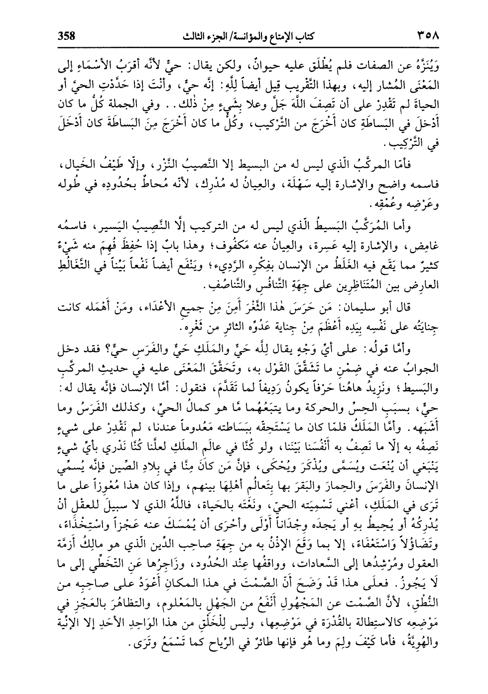 وينزّه عن الصفات فلم يطلق عليه حيوان، ولكن يقال: حيّ لأنّه أقرب الأسماء إلى المعنى المشار إليه، وبهذا التّقريب قيل أيضا لله: إنّه حيّ، وأنت إذا حدّدت الحيّ أو الحياة لم تقدر على أن تصف الله جلّ وعلا بشيء من ذلك ... وفي الجملة كلّ ما كان أدخل في البساطة كان أخرج من التّركيب، وكلّ ما كان أخرج من البساطة كان أدخل في التّركيب.