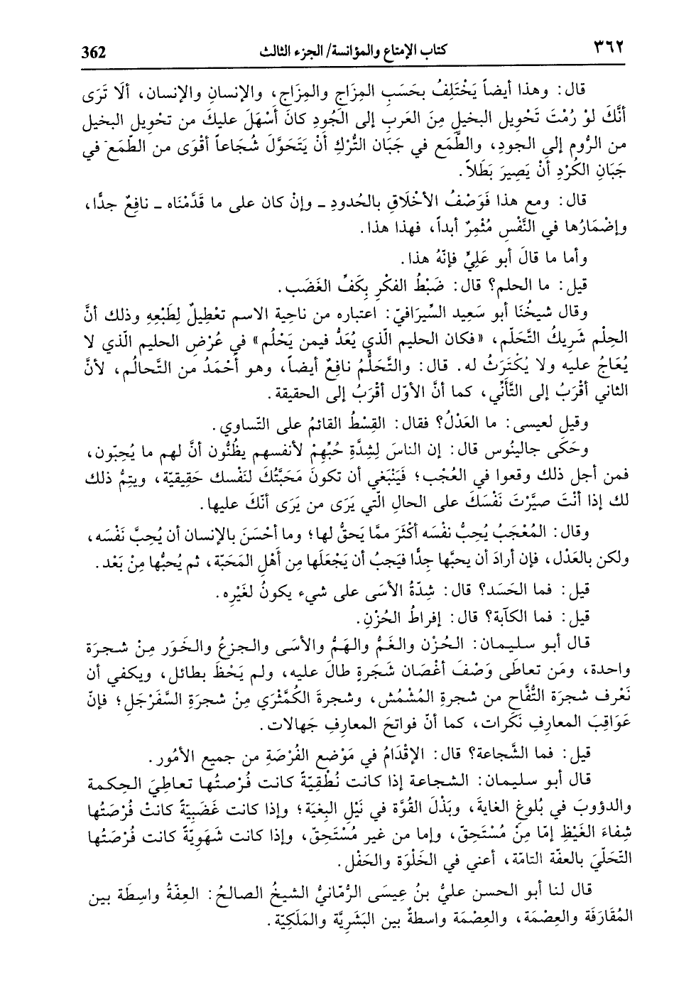 وقال شيخنا أبو سعيد السّيرافيّ: اعتباره من ناحية الاسم تعطيل لطبعه وذلك أنّ الحلم شريك التّحلّم، «فكان الحليم الّذي يعدّ فيمن يحلم» في عرض الحليم الّذي لا يعاج عليه ولا يكترث له. قال: والتّحلّم نافع أيضا، وهو أحمد من التّحالم، لأنّ الثّاني أقرب إلى التّأنّي، كما أنّ الأوّل أقرب إلى الحقيقة.