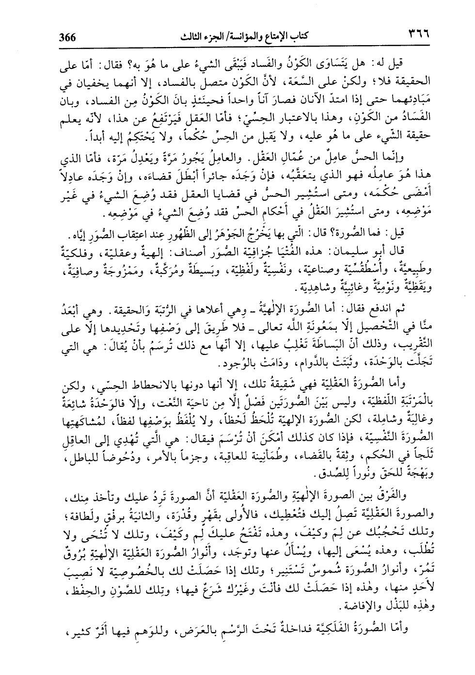 والفرق بين الصورة الإلهيّة والصّورة العقليّة أنّ الصورة ترد عليك وتأخذ منك، والصورة العقليّة تصل إليك فتعطيك، فالأولى بقهر وقدرة، والثانية برفق ولطافة، وتلك تحجبك عن لم وكيف، وهذه تفتح عليك لم وكيف، وتلك لا تنحى ولا تطلب، وهذه يسعى إليها، ويسأل عنها وتوجد، وأنوار الصّورة العقليّة الإلهيّة بروق تمرّ، وأنوار الصّورة شموس تستنير، وتلك إذا حصلت لك بالخصوصيّة لا نصيب لأحد منها، وهذه إذا حصلت لك فأنت وغيرك شرع فيها، وتلك للصّون والحفظ، وهذه للبذل والإفاضة.