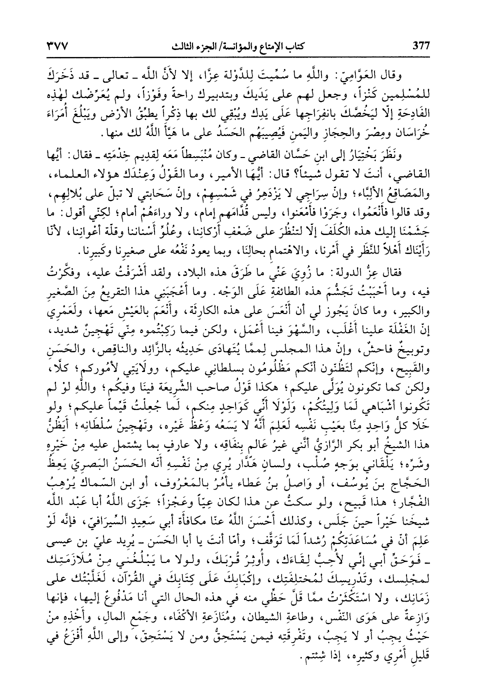 فقال عزّ الدولة: ما زوي عنّي ما طرق هذه البلاد، ولقد أشرفت عليه، وفكّرت فيه، وما أحببت تجشّم هذه الطائفة على الوجه. وما أعجبني هذا التقريع من الصّغير والكبير، وما كان يجوز لي أن أنعس على هذه الكارثة، وأنعم بالعيش معها، ولعمري إنّ الغفلة علينا أغلب، والسّهو فينا أعمل، ولكن فيما ركبتموه منّي تهجين شديد، وتوبيخ فاحش، وإنّ هذا المجلس لممّا يتهادى حديثه بالزّائد والناقص، والحسن والقبيح، وإنّكم لتظنّون أنّكم مظلومون بسلطاني عليكم، وولايتي لأموركم، كلّا، ولكن كما تكونون يولّى عليكم، هكذا قول صاحب الشّريعة فينا وفيكم، والله لو لم تكونوا أشباهي لما وليتكم، ولولا أنّي كواحد منكم، لما جعلت قيّما عليكم، ولو خلا كلّ واحد منّا بعيب نفسه لعلم أنّه لا يسعه وعظ غيره، وتهجين سلطانه، أيظنّ هذا الشيخ أبو بكر الرّازيّ أنّني غير عالم بنفاقه، ولا عارف بما يشتمل عليه من خيره وشرّه، يلقاني بوجه صلب، ولسان هدّار يري من نفسه أنّه الحسن البصريّ يعظ الحجّاج بن يوسف، أو واصل بن عطاء يأمر بالمعروف، أو ابن السّماك يرهب الفجّار، هذا قبيح، ولو سكتّ عن هذا لكان عيّا وعجزا، جزى الله أبا عبد الله شيخنا خيرا حين جلس، وكذلك أحسن الله عنّا مكافأة أبي سعيد السّيرافيّ، فإنّه لو علم أنّ في مساعدتكم رشدا لما توقّف، وأمّا أنت يا أبا الحسن- يريد عليّ بن عيسى- فوحقّ أبي إنّي لأحبّ لقاءك، وأوثر قربك، ولولا ما يبلغني من ملازمتك لمجلسك، وتدريسك لمختلفتك، وإكبابك على كتابك في القرآن، لغلّبتك على زمانك، ولا استكثرت ممّا قلّ حظّي منه في هذه الحال التي أنا مدفوع إليها، فإنها وازعة على هوى النّفس، وطاعة الشيطان، ومنازعة الأكفاء، وجمع المال، وأخذه من حيث يجب أو لا يجب، وتفرقته فيمن يستحقّ ومن لا يستحقّ، وإلى الله أفزع في قليل أمري وكثيره، إذا شئتم.