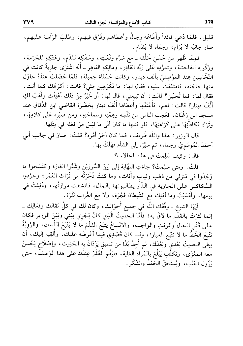 أيّها الشيخ- وفّقك الله في جميع أحوالك، وكان لك في كلّ مقالك وفعالك- إنما نثرت بالقلم ما لاق به، فأمّا الحديث الّذي كان يجري بيني وبين الوزير فكان على قدر الحال والوقت والواجب، والاتّساع يتبع القلم ما لا يتبع اللّسان، والرّويّة تتبع الخطّ ما لا تتبع العبارة، ولما كان قصدي فيما أعرضه عليك، وألقيه إليك، أن يبقى الحديث بعدي وبعدك، لم أجد بدّا من تنميق يزدان به الحديث، وإصلاح يحسن معه المغزى، وتكلّف يبلغ بالمراد الغاية، فليقم العذر عندك على هذا الوصف، حتى يزول العتب، ويستحقّ الحمد والشّكر.