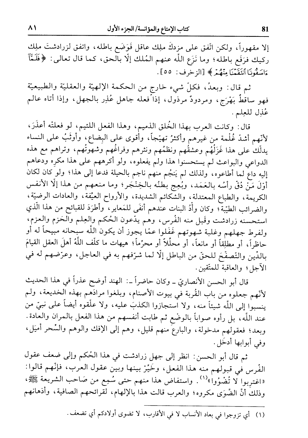 قال: وكانت العرب بهذا الخلق الذميم، وهذا الفعل اللئيم، لو فعلته أعذر، لأنّهم أشدّ غلمة من غيرهم وأكثر تهيّجا، وأقوى على البضاع، وأوثب على النساء يدلّك على هذا غزلهم وعشقهم ونظمهم ونثرهم وفراغهم وشهوتهم، وتراهم مع هذه الدواعي والبواعث لم يستحسنوا هذا ولم يفعلوه، ولو أكرههم على هذا مكره ودعاهم إليه داع لما أطاعوه، ولذلك لم ينجم منهم ناجم بالحيلة فدعا إلى هذا، ولو كان لكان أوّل من دقّ رأسه بالعمد، وبعج بطنه بالخنجر، وما منعهم من هذا إلّا الأنفس الكريمة، والطباع المعتدلة، والشكائم الشديدة، والأرواح العيّفة، والعادات الرضيّة، والضرائب الطيّبة، وكان وأد البنات عندهم أنفى للمعاير، وأطرد للقبائح من هذا الّذي استحسنه زرادشت وقبل منه الفرس، وهم يدّعون الحكم والعلم والحزم والعزم، ولفرط جهلهم وغلبة شهوتهم غفلوا عمّا يجوز أن يكون الله سبحانه مبيحا له أو حاظرا، أو مطلقا أو مانعا، أو محلّلا أو محرّما، هيهات ما كلّف الله أهل العقل القيام بالدّين والتّصفّح للحقّ من الباطل إلّا لما شرّفهم به في العاجل، وعرّضهم له في الآجل، والعاقبة للمتّقين.