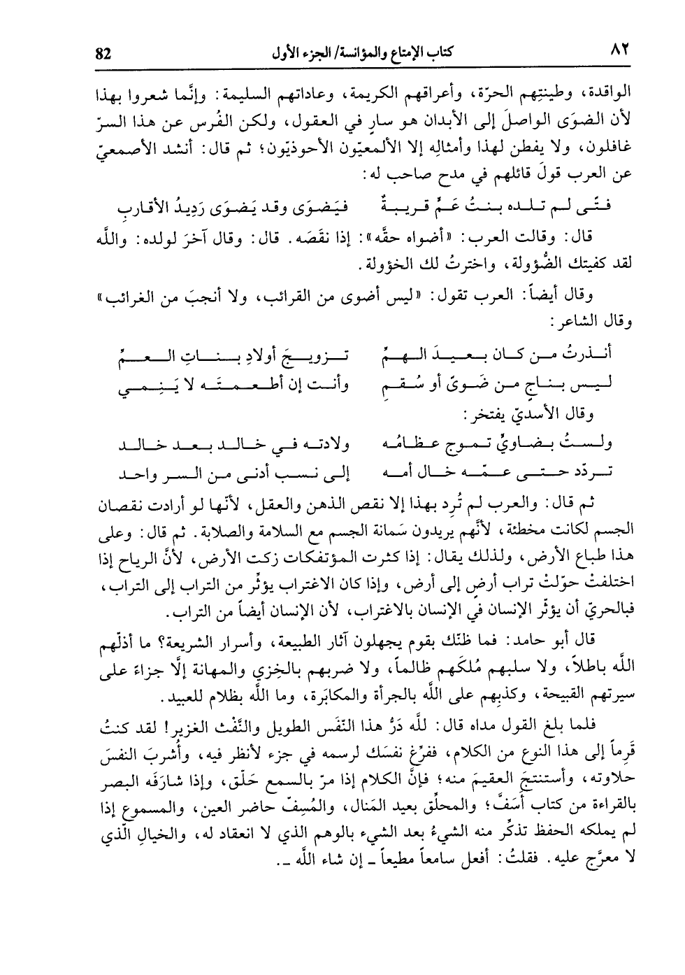 الواقدة، وطينتهم الحرّة، وأعراقهم الكريمة، وعاداتهم السليمة: وإنّما شعروا بهذا لأن الضوى الواصل إلى الأبدان هو سار في العقول، ولكن الفرس عن هذا السرّ غافلون، ولا يفطن لهذا وأمثاله إلّا الألمعيّون الأحوذيّون، ثم قال: أنشد الأصمعيّ عن العرب قول قائلهم في مدح صاحب له: