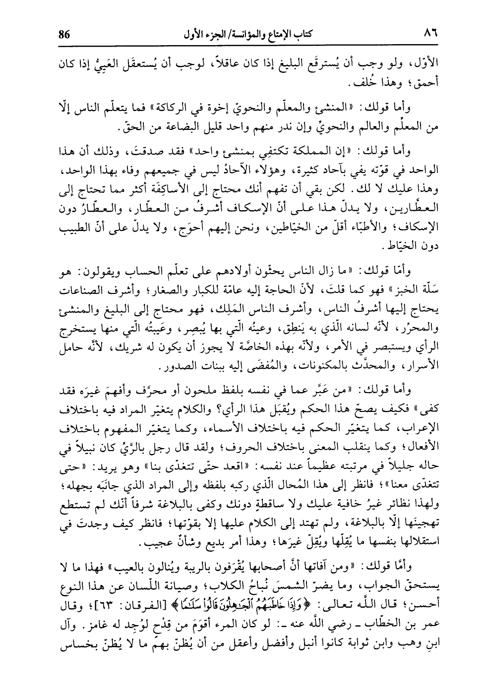 وأما قولك: «المنشئ والمعلّم والنحويّ إخوة في الركاكة» فما يتعلّم الناس إلّا من المعلّم والعالم والنحويّ وإن ندر منهم واحد قليل البضاعة من الحقّ.