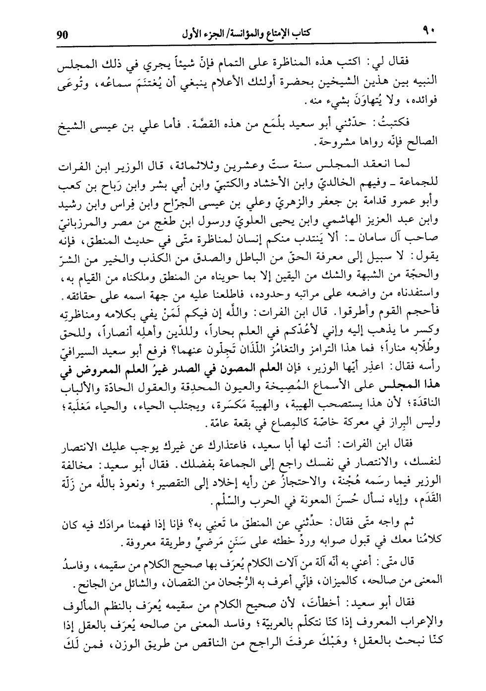 فقال أبو سعيد: أخطأت، لأن صحيح الكلام من سقيمه يعرف بالنظم المألوف والإعراب المعروف إذا كنّا نتكلّم بالعربيّة، وفاسد المعنى من صالحه يعرف بالعقل إذا كنّا نبحث بالعقل، وهبك عرفت الراجح من الناقص من طريق الوزن، فمن لك
