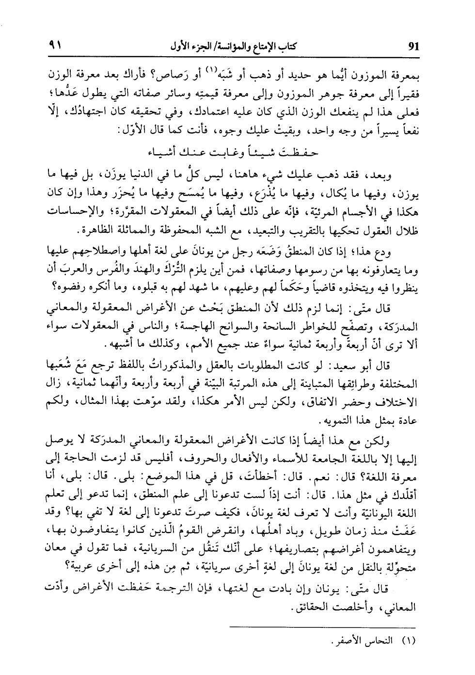 ولكن مع هذا أيضا إذا كانت الأغراض المعقولة والمعاني المدركة لا يوصل إليها إلا باللغة الجامعة للأسماء والأفعال والحروف، أفليس قد لزمت الحاجة إلى معرفة اللغة؟ قال: نعم. قال: أخطأت، قل في هذا الموضع: بلى. قال: بلى، أنا أقلّدك في مثل هذا. قال: أنت إذا لست تدعونا إلى علم المنطق، إنما تدعو إلى تعلم اللغة اليونانيّة وأنت لا تعرف لغة يونان، فكيف صرت تدعونا إلى لغة لا تفي بها؟ وقد عفت منذ زمان طويل، وباد أهلها، وانقرض القوم الّذين كانوا يتفاوضون بها، ويتفاهمون أغراضهم بتصاريفها، على أنّك تنقل من السريانية، فما تقول في معان متحوّلة بالنقل من لغة يونان إلى لغة أخرى سريانيّة، ثم من هذه إلى أخرى عربية؟