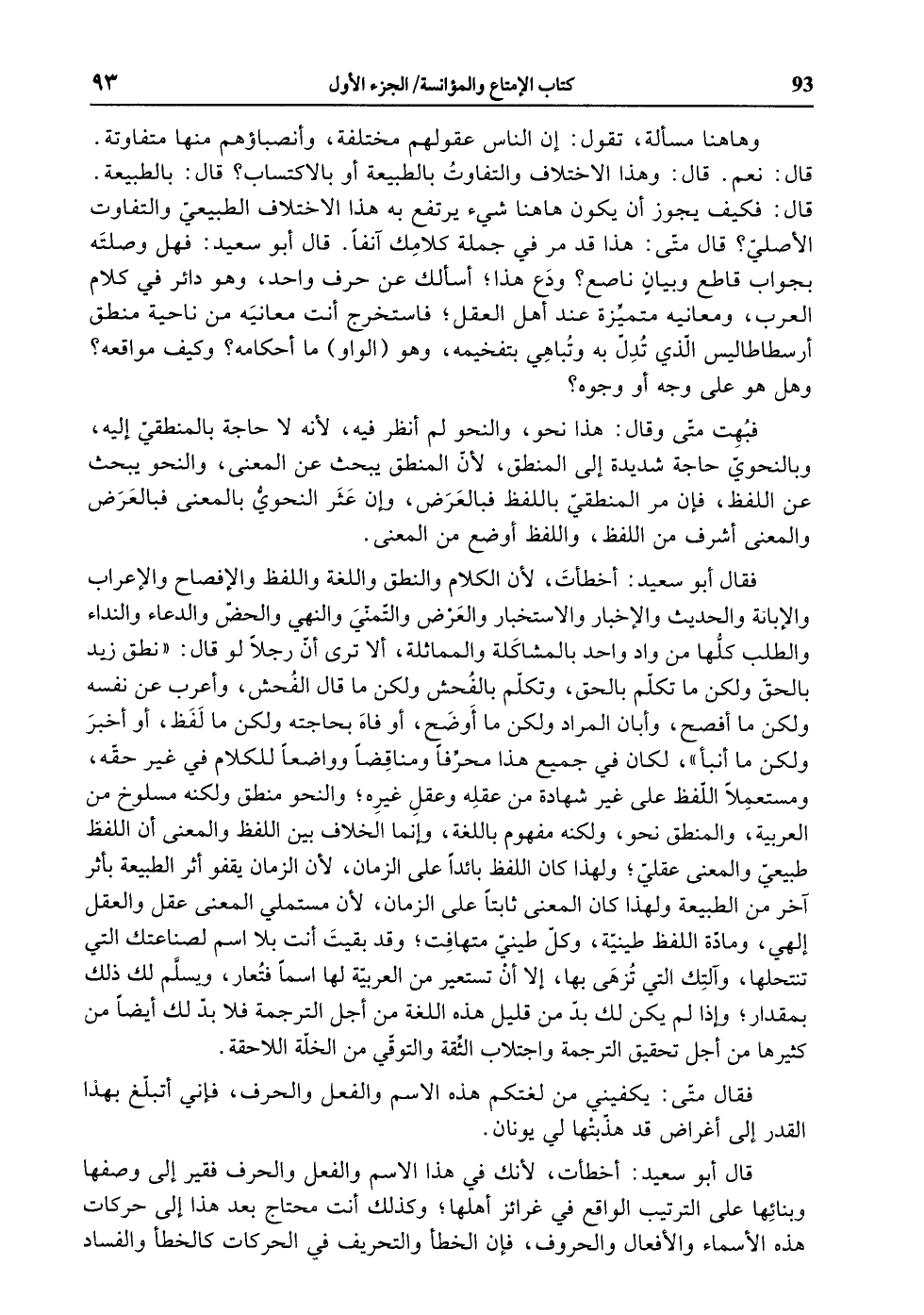فقال أبو سعيد: أخطأت، لأن الكلام والنطق واللغة واللفظ والإفصاح والإعراب والإبانة والحديث والإخبار والاستخبار والعرض والتّمنّي والنهي والحضّ والدعاء والنداء والطلب كلّها من واد واحد بالمشاكلة والمماثلة، ألا ترى أنّ رجلا لو قال: «نطق زيد بالحقّ ولكن ما تكلّم بالحق، وتكلّم بالفحش ولكن ما قال الفحش، وأعرب عن نفسه ولكن ما أفصح، وأبان المراد ولكن ما أوضح، أو فاه بحاجته ولكن ما لفظ، أو أخبر ولكن ما أنبأ» ، لكان في جميع هذا محرّفا ومناقضا وواضعا للكلام في غير حقّه، ومستعملا اللّفظ على غير شهادة من عقله وعقل غيره، والنحو منطق ولكنه مسلوخ من العربية، والمنطق نحو، ولكنه مفهوم باللغة، وإنما الخلاف بين اللفظ والمعنى أن اللفظ طبيعيّ والمعنى عقليّ، ولهذا كان اللفظ بائدا على الزمان، لأن الزمان يقفوا أثر الطبيعة بأثر آخر من الطبيعة ولهذا كان المعنى ثابتا على الزمان، لأن مستملي المعنى عقل والعقل إلهي، ومادّة اللفظ طينيّة، وكلّ طينيّ متهافت، وقد بقيت أنت بلا اسم لصناعتك التي تنتحلها، وآلتك التي تزهى بها، إلا أن تستعير من العربيّة لها اسما فتعار، ويسلّم لك ذلك بمقدار، وإذا لم يكن لك بدّ من قليل هذه اللغة من أجل الترجمة فلابدّ لك أيضا من كثيرها من أجل تحقيق الترجمة واجتلاب الثّقة والتوقّي من الخلّة اللاحقة.