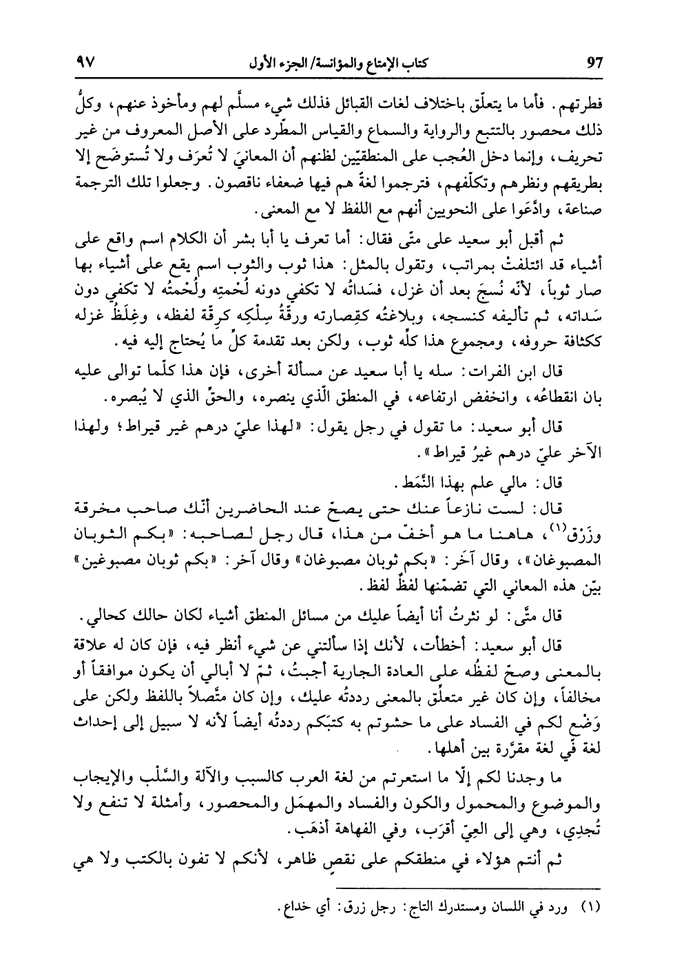 قال أبو سعيد: أخطأت، لأنك إذا سألتني عن شيء أنظر فيه، فإن كان له علاقة بالمعنى وصحّ لفظه على العادة الجارية أجبت، ثمّ لا أبالي أن يكون موافقا أو مخالفا، وإن كان غير متعلّق بالمعنى رددته عليك، وإن كان متّصلا باللفظ ولكن على وضع لكم في الفساد على ما حشوتم به كتبكم رددته أيضا لأنه لا سبيل إلى إحداث لغة في لغة مقرّرة بين أهلها.