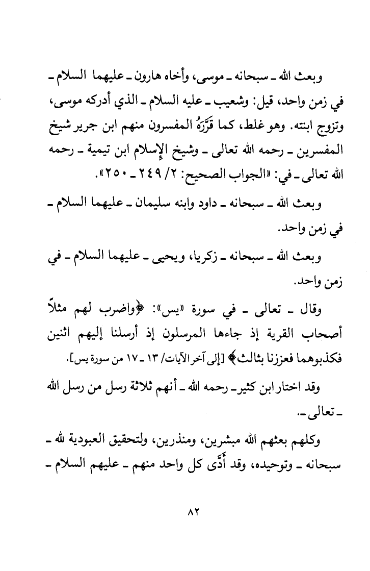 وبعث الله - سبحانه موسى، وأخاه هارون - عليهما السلام - في زمن واحد، قيل: وشعيب - عليه السلام - الذي أدركه موسى، وتزوج ابنته. وهو غلط، كما قرره المفسرون منهم ابن جرير شيخ المفسرين - رحمه الله تعالى - وشيخ الإسلام ابن تيمية - رحمه الله تعالى - في: " الجواب الصحيح: 2 / 249 - 250 ".
