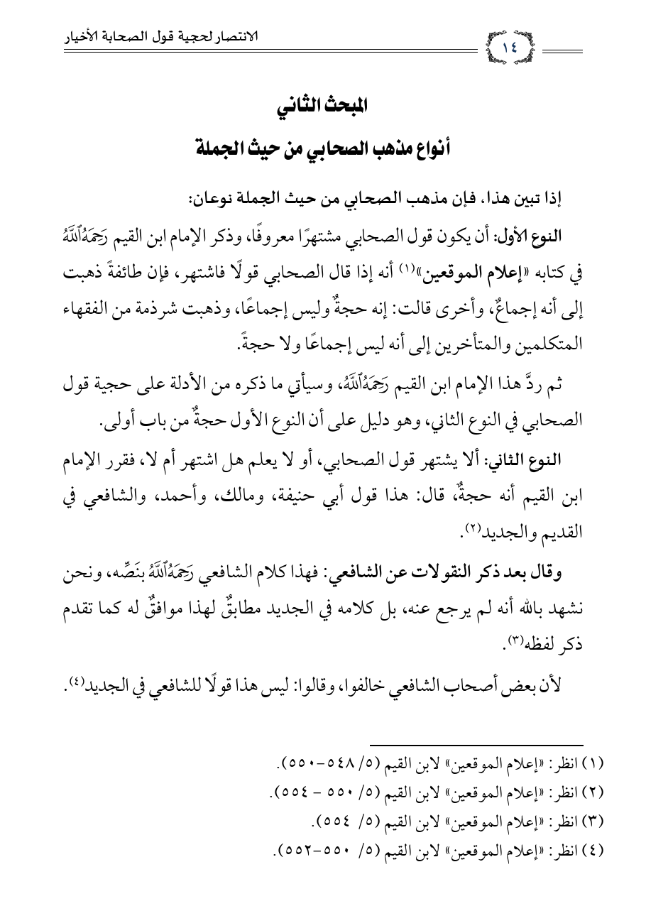 النوع الثاني: ألا يشتهر قول الصحابي، أو لا يعلم هل اشتهر أم لا، فقرر الإمام ابن القيم أنه حجةٌ، قال: هذا قول أبي حنيفة ومالك وأحمد والشافعي في القديم والجديد (¬٢).
