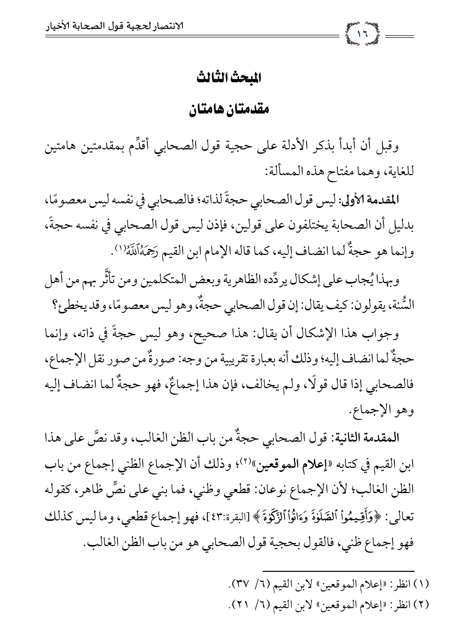 المقدمة الثانية: قول الصحابي حجةٌ من باب الظن الغالب، وقد نصَّ على هذا ابن القيم في كتابه «إعلام الموقعين» (¬٢)؛ وذلك أن الإجماع الظني إجماع من باب الظن الغالب؛ لأن الإجماع نوعان: قطعي وظني، فما بني على نصٍّ ظاهر، كقوله تعالى: {أَقِيمُوا الصَّلَاةَ وَآتُوا الزَّكَاةَ}، فهو إجماع قطعي، وما ليس كذلك فهو إجماع ظني، فالقول بحجية قول الصحابي هو من باب الظن الغالب.