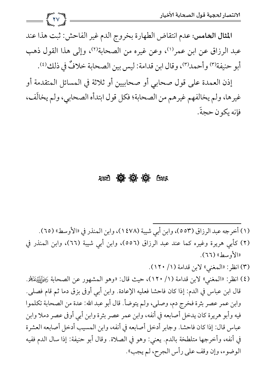المثال الخامس: عدم انتقاض الطهارة بخروج الدم غير الفاحش: ثبت هذا عند عبد الرزاق عن ابن عمر (¬١)، وعن غيره من الصحابة (¬٢)، وإلى هذا القول ذهب أبو حنيفة (¬٣) وأحمد (¬٤)، وقال ابن قدامة: ليس بين الصحابة خلاف في ذلك (¬٥).