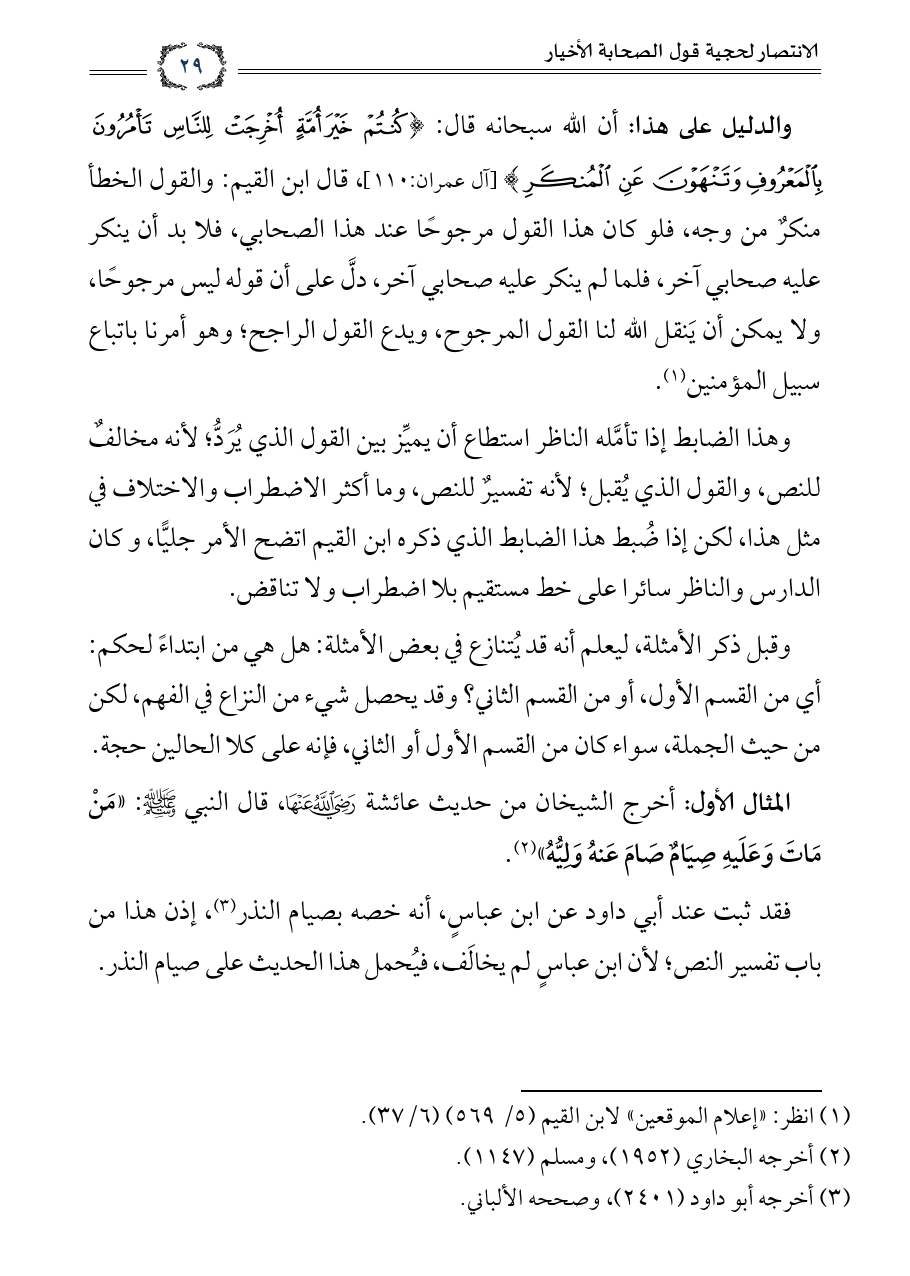 والدليل على هذا: أن الله سبحانه قال: {كُنتُمْ خَيْرَ أُمَّةٍ أُخْرِجَتْ لِلنَّاسِ تَأْمُرُونَ بِالْمَعْرُوفِ وَتَنْهَوْنَ عَنِ الْمُنكَرِ}، قال ابن القيم: والقول الخطأ منكرٌ من وجه، فلو كان هذا القول مرجوحًا عند هذا الصحابي، فلا بد أن ينكر عليه صحابي آخر، فلما لم ينكر عليه صحابي آخر، دل على أن قوله ليس مرجوحًا، ولا يمكن أن ينقل الله لنا القول المرجوح، ويدع القول الراجح؛ وهو أمرنا باتباع سبيل المؤمنين (¬١).