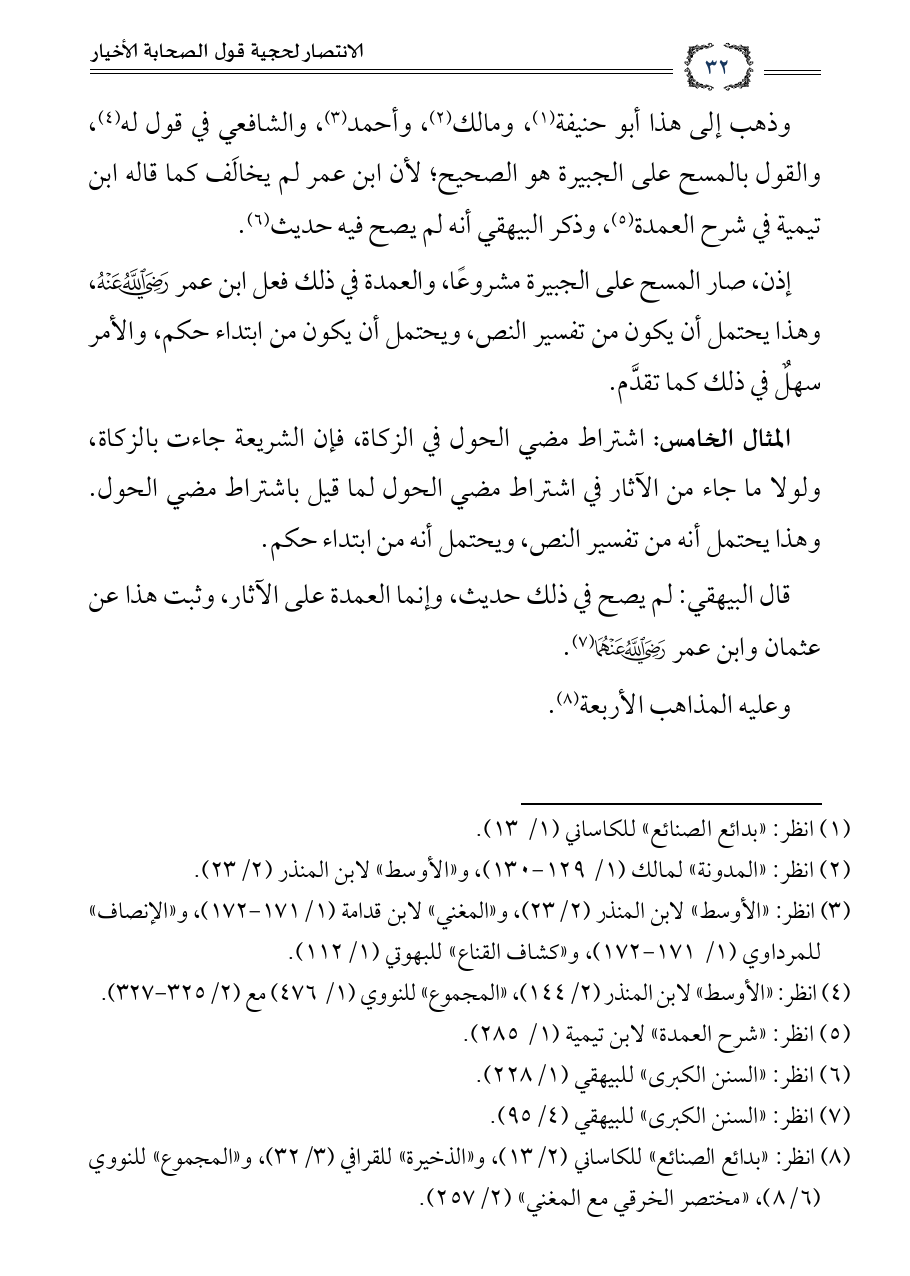 (¬٨) انظر: «بدائع الصنائع» للكاساني (٢/ ١٣)، و «الذخيرة» للقرافي (٣/ ٣٢)، و «المجموع» للنووي (٦/ ٨)، «مختصر الخرقي مع المغني» (٢/ ٢٥٧).