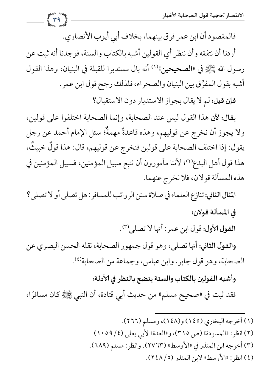 المثال الثاني: تنازع العلماء في صلاة سنن الرواتب للمسافر: هل تصلى أو لا تصلى؟