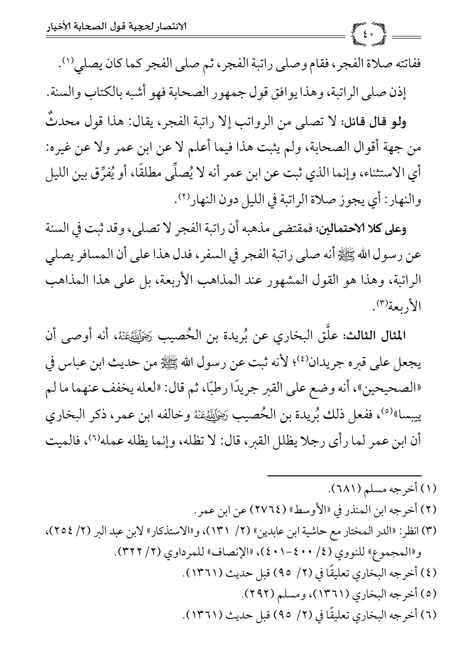 ولو قال قائل: لا تصلى من الرواتب إلا راتبة الفجر، يقال: هذا قول محدثٌ من جهة أقوال الصحابة، ولم يثبت هذا فيما أعلم لا عن ابن عمر ولا عن غيره: أي الاستثناء، وإنما الذي ثبت عن ابن عمر أنه لا يُصلِّى مطلقا، أو يُفرِّق بين الليل والنهار: أي يجوز صلاة الراتبة في الليل دون النهار (¬٢).