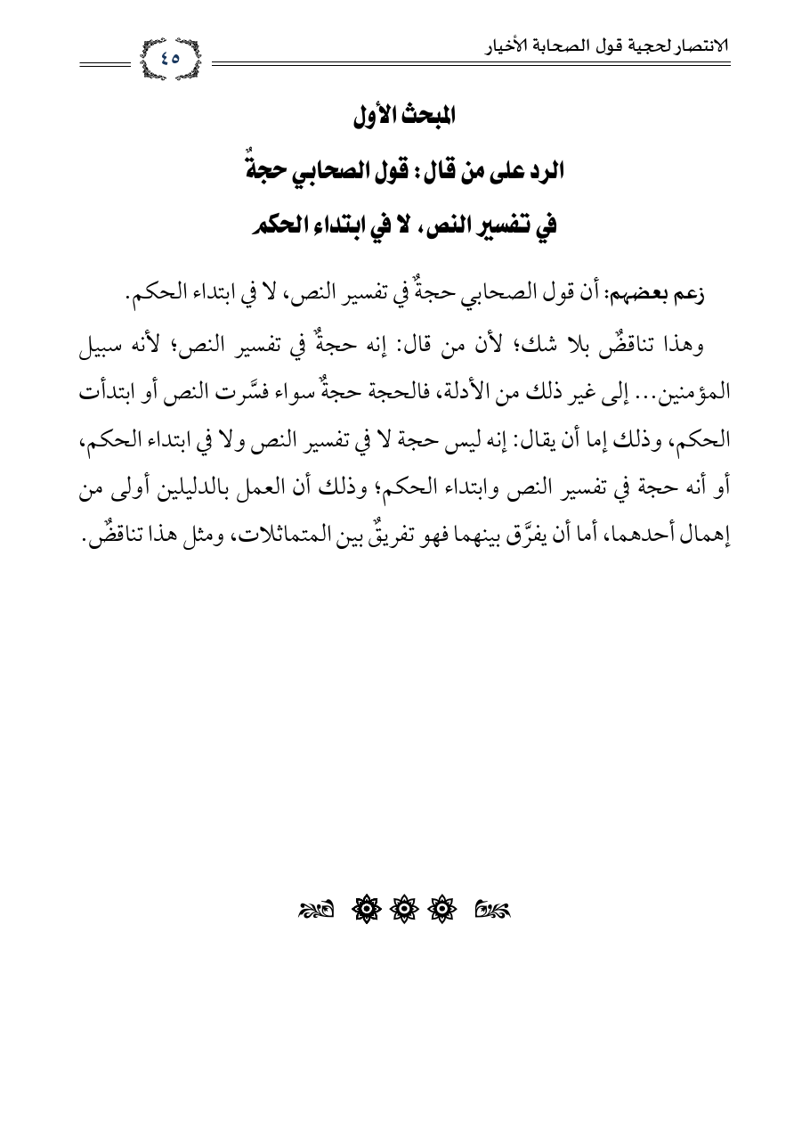وهذا تناقض بلا شك؛ لأن من قال: إنه حجةٌ في تفسير النص؛ لأنه سبيل المؤمنين ... إلى غير ذلك من الأدلة، فالحجة حجةٌ سواء فسَّرت النص أو ابتدأت الحكم، وذلك إما أن يقال: إنه ليس حجة لا في تفسير النص ولا في ابتداء الحكم، أو أنه حجة في تفسير النص وابتداء الحكم؛ وذلك أن العمل بالدليلين أولى من إهمال أحدهما، أما أن يفرَّق بينهما فهو تفريقٌ بين المتماثلات، ومثل هذا تناقضٌ.