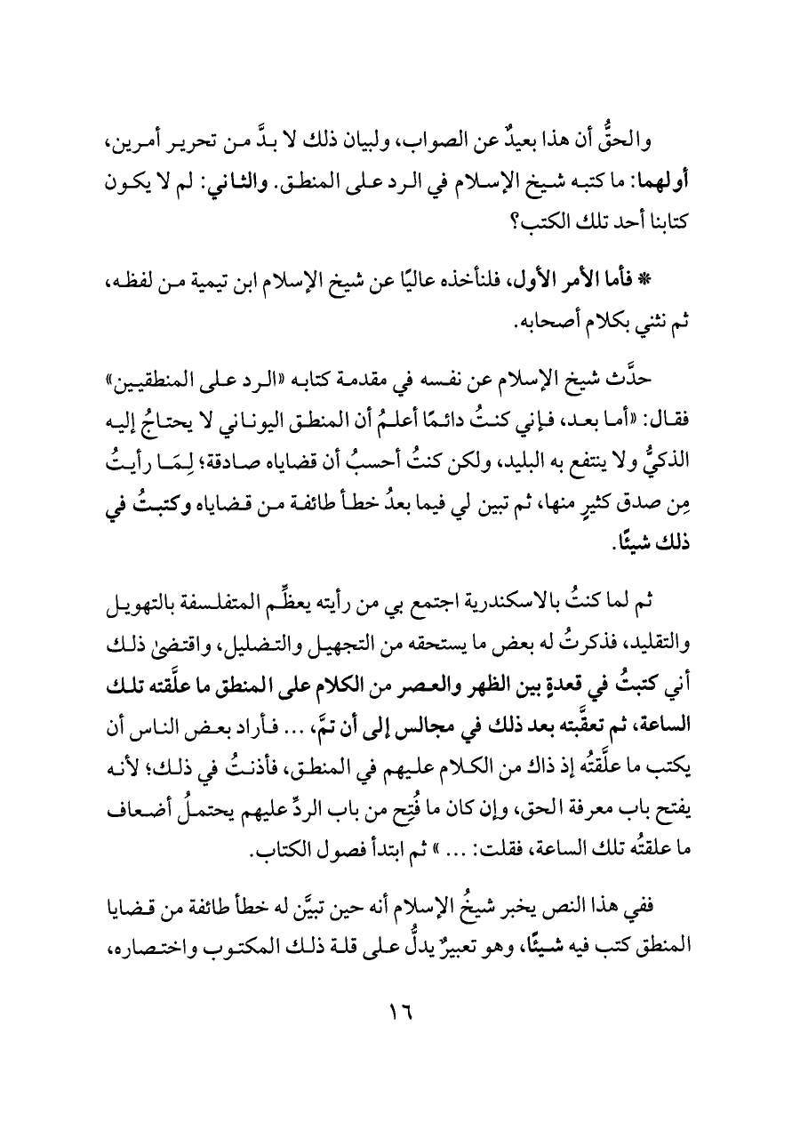 والحقُّ أن هذا بعيدٌ عن الصواب, ولبيان ذلك لا بدَّ من تحرير أمرين, أولهما: ما كتبه شيخ الإسلام في الرد على المنطق. والثاني: لم لا يكون كتابنا أحد تلك الكتب؟