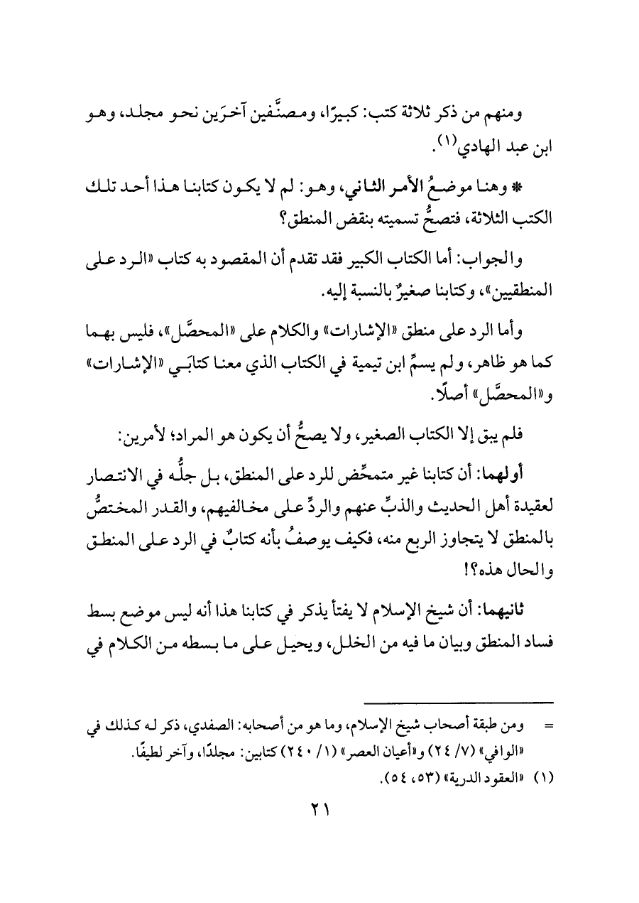 أولهما: أن كتابنا غير متمحِّض للرد على المنطق, بل جلُّه في الانتصار لعقيدة أهل الحديث والذبِّ عنهم والردِّ على مخالفيهم, والقدر المختصُّ بالمنطق لا يتجاوز الربع منه, فكيف يوصفُ بأنه كتابٌ في الرد على المنطق والحال هذه؟ !