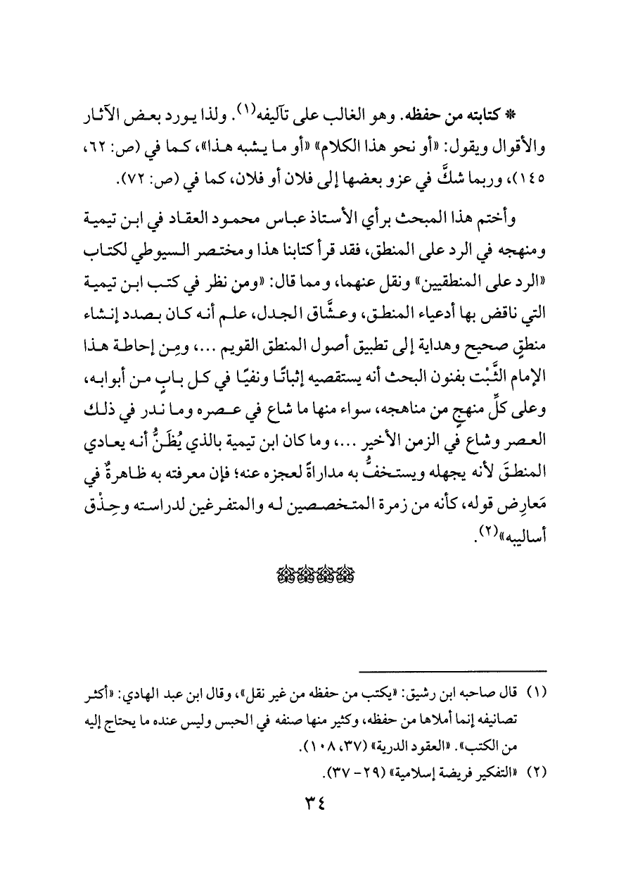 (¬١) قال صاحبه ابن رشيق: «يكتب من حفظه من غير نقل» , وقال ابن عبد الهادي: «أكثر تصانيفه إنما أملاها من حفظه, وكثير منها صنفه في الحبس وليس عنده ما يحتاج إليه من الكتب». «العقود الدرية» (٣٧, ١٠٨).