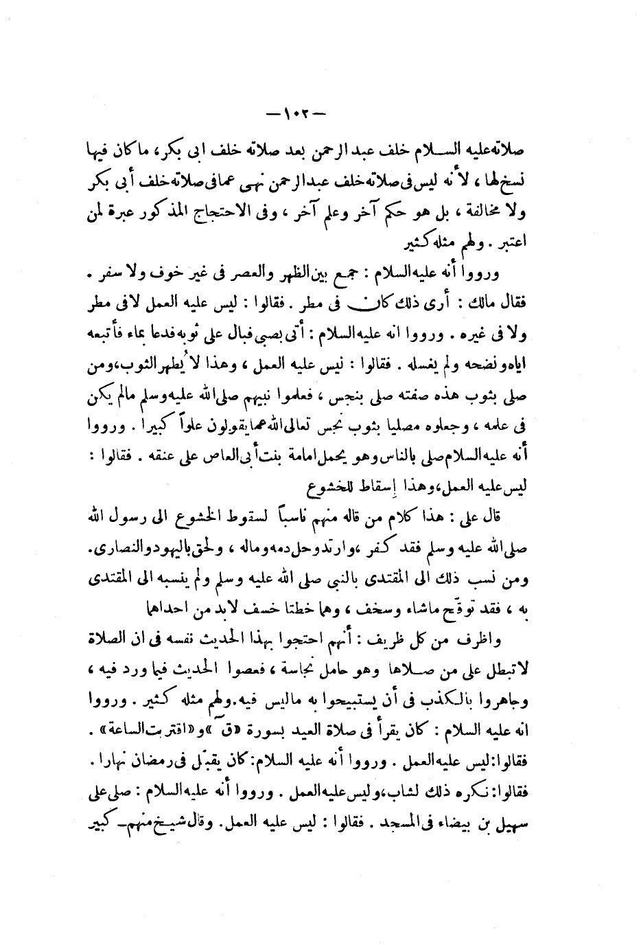 صلاته عليه السلام خلف عبد الرحمن بعد صلاته خلف أبي بكر ما كان فيها نسخ لها لأنه ليس في صلاته خلف عبد الرحمن نهي عما في صلاته خلف أبي بكر ولا مخالفة بل هو حكم آخر وعلم آخر وفي الاحتجاج المذكور عبرة لمن اعتبر ولهم مثله كثير ورووا أنه عليه السلام جمع بين الظهر والعصر في غير خوف ولا سفر فقال مالك أرى ذلك كان من مطر فقالوا ليس عليه العمل لا في مطر ولا في غيره ورووا أنه عليه السلام أتي بصبي فبال على ثوبه فدعا بماء فأتبعه إياه ونضحه ولم يغسله فقالوا ليس عليه العمل وهذا لا يطهر الثوب ومن صلى بثوب هذا صفته صلى بنجس فعلموا نبيهم صلى الله عليه وسلم ما لم يكن في علمه وجعلوه مصليا بثوب نجس تعالى الله عما يقولون علوا كبيرا ورووا أنه عليه السلام صلى بالناس وهو يحمل أمامة بنت أبي العاص على عنقه فقالوا ليس عليه العمل وهذا إسقاط للخشوع قال علي هذا كلام من قاله منهم ناسبا لسقوط الخشوع إلى رسول الله صلى الله عليه وسلم فقد كفر وارتد وحل دمه وماله ولحق باليهود والنصارى ومن نسب ذلك إلى المقتدي بالنبي صلى الله عليه وسلم ولم ينسبه إلى المقتدي به فقد توقح ما شاء وسخف وهما خطتا خسف لا بد من إحداهما وأظرف من