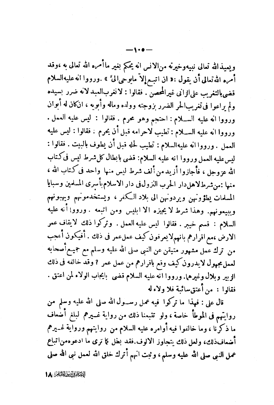 السلام تطيب لحله قبل أن يطوف بالبيت فقالوا ليس عليه العمل ورووا أنه عليه السلام قضى بإبطال كل شرط ليس في كتاب الله عز وجل فأجازوا أزيد من ألف شرط ليس منها واحد في كتاب الله منها من شرط لأهل دار الحرب النزول في دار الإسلام بأسرى المسلمين وسبايا المسلمات يطؤونهن ويردونهن إلى بلاد الكفر ويستخدمونهم ويهبونهم ويبيعونهم وهذا شرط لا يجيزه إلا إبليس ومن اتبعه ورووا أنه عليه السلام قسم خيبر فقالوا ليس عليه العمل وتركوا ذلك لإيقاف عمر الأرض مع إقرارهم بأنهم لا يعرفون كيف عمل عمر في ذلك أفيكون أعجب من ترك عمل مشهور متيقن على النبي صلى الله عليه وسلم مع جميع أصحابه لعمل مجهول لا يدرون كيف وقع بإقرارهم من عمل عمر وقد خالفه في ذلك الزبير وبلال وغيرهما ورووا أنه عليه السلام قضى بإيجاب الولاء لمن أعتق فقالوا من أعتق سائبة فلا ولاء له قال علي فهذا ما تركوا فيه عمل رسول الله صلى الله عليه وسلم من روايتهم في الموطأ خاصة ولو تتبعنا ذلك من رواية غيرهم لبلغ أضعاف ما ذكرنا وما خالفوا فيه أوامره عليه السلام من روايتهم ورواية غيرهم أضعاف ذلك ولعل ذلك يتجاوز الألوف فقد بطل كما ترى ما ادعوه من اتباع عمل النبي صلى الله عليه وسلم وثبت أنهم أترك خلق الله لعمل نبي الله صلى