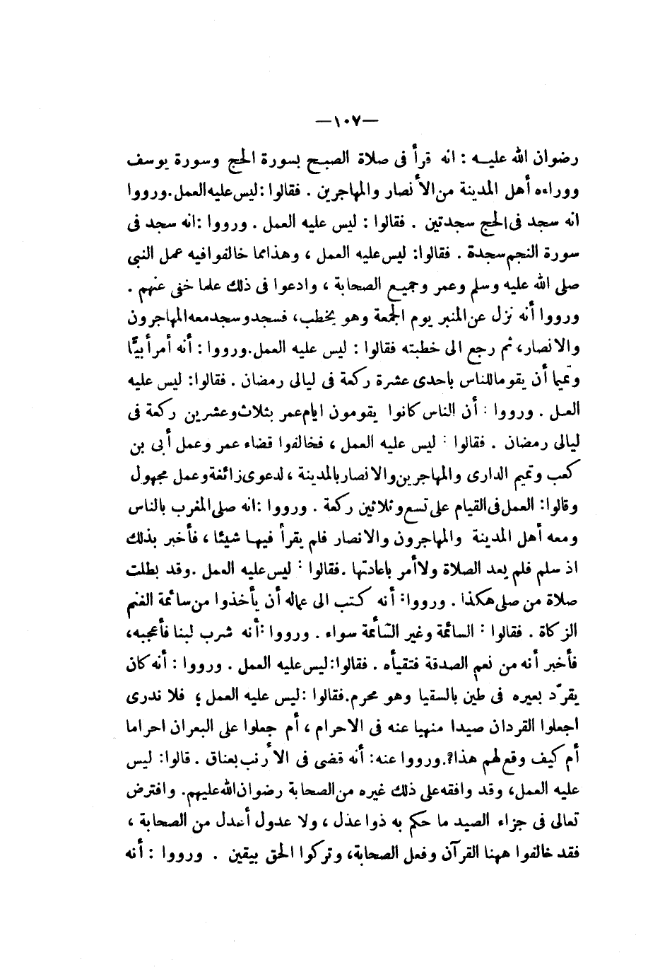 رضوان الله عليه أنه قرأ في صلاة الصبح بسورة الحج وسورة يوسف ووراءه أهل المدينة من الأنصار والمهاجرين فقالوا ليس عليه العمل ورووا أنه سجد في الحج سجدتين فقالوا ليس عليه العمل ورووا أنه سجد في سورة النجم سجدة فقالوا ليس عليه العمل وهذا مما خالفوا فيه عمل النبي صلى الله عليه وسلم وعمر وجميع الصحابة وادعوا في ذلك علما خفي عنهم ورووا أنه نزل عن المنبر يوم الجمعة وهو يخطب فسجد وسجد معه المهاجرون والأنصار ثم رجع إلى خطبته فقالوا ليس عليه العمل ورووا أمر أبيا وتميما أن يقوما للناس بإحدى عشرة ركعة في ليالي رمضان فقالوا ليس عليه العمل ورووا أن الناس كانوا يقومون أيام عمر بثلاث وعشرين ركعة في ليالي رمضان فقالوا ليس عليه العمل فخالفوا قضاء عمر وعمل أبي بن كعب